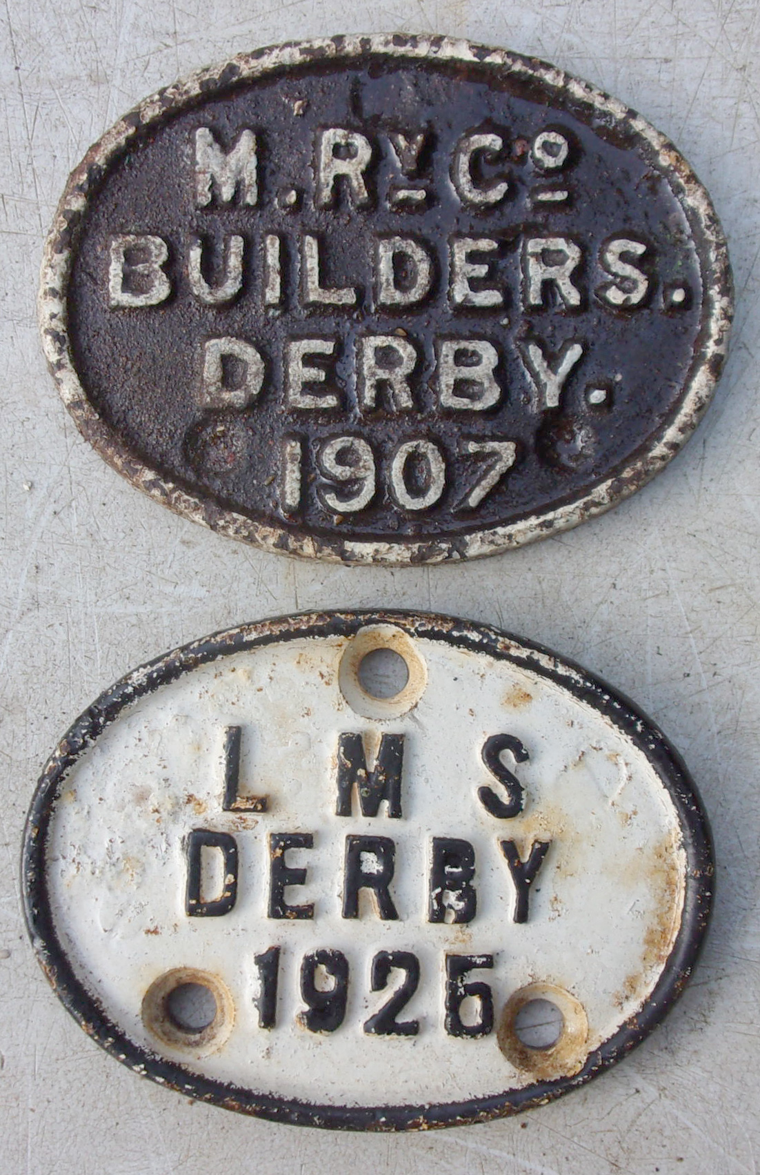 2 x Carriage Plates “MRY Co. Builders Derby 1907”, also LMS Derby 1925. Repainted face.