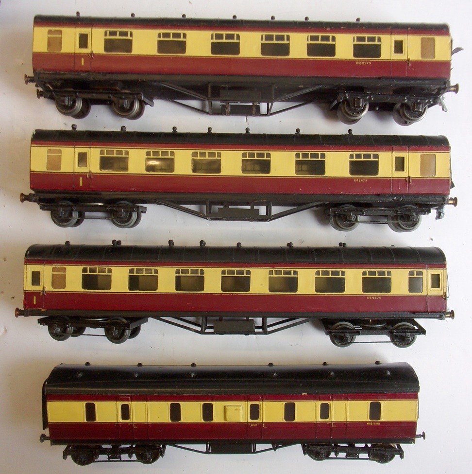 4 x 00 GAUGE COACHES, wooden construction, in good used condition. Maroon & Cream livery, 3 x rail.
