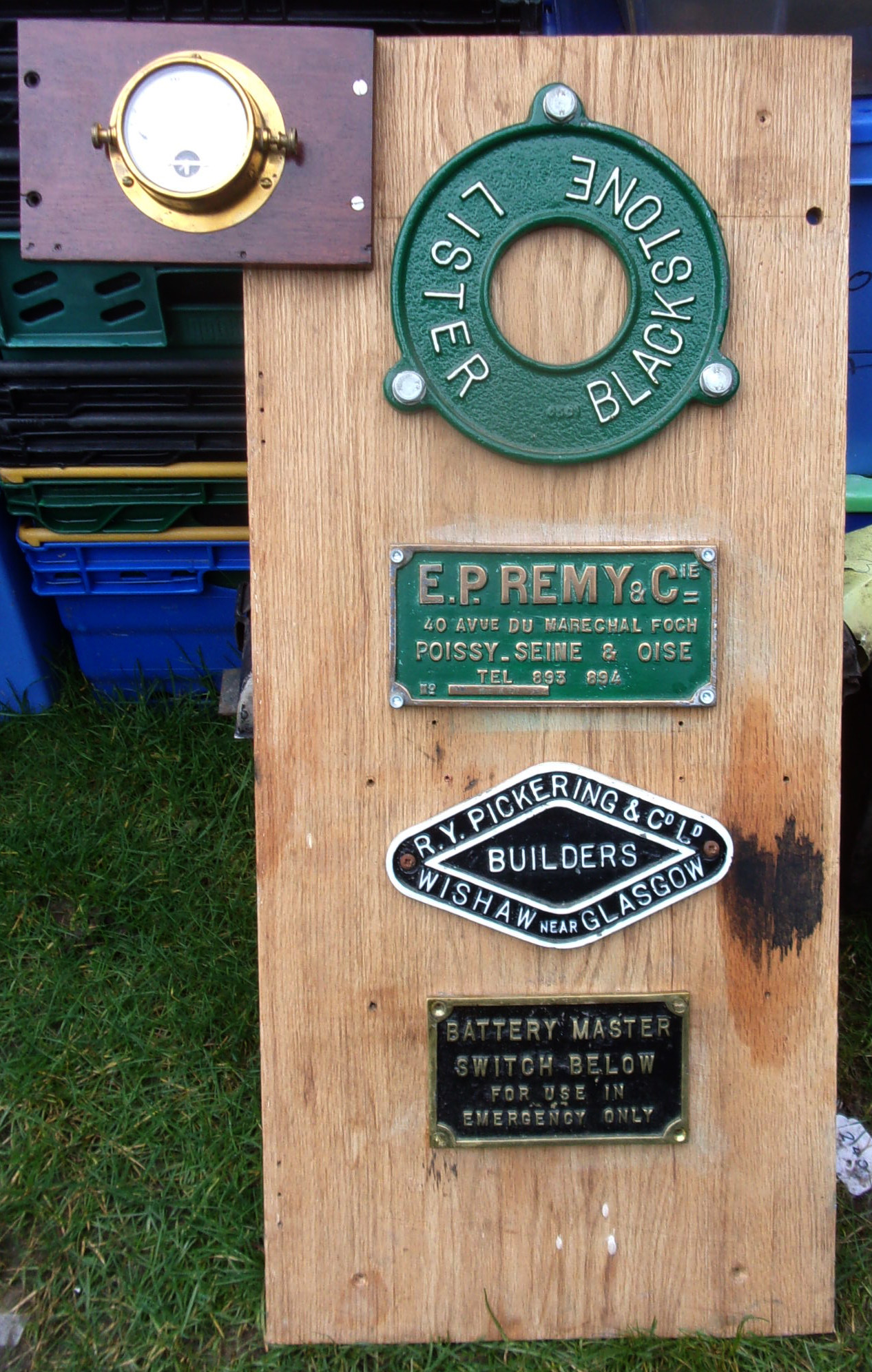 A collection of items affixed to a display board, as pictured. Including 4 x makers plates and one pressure gauge.