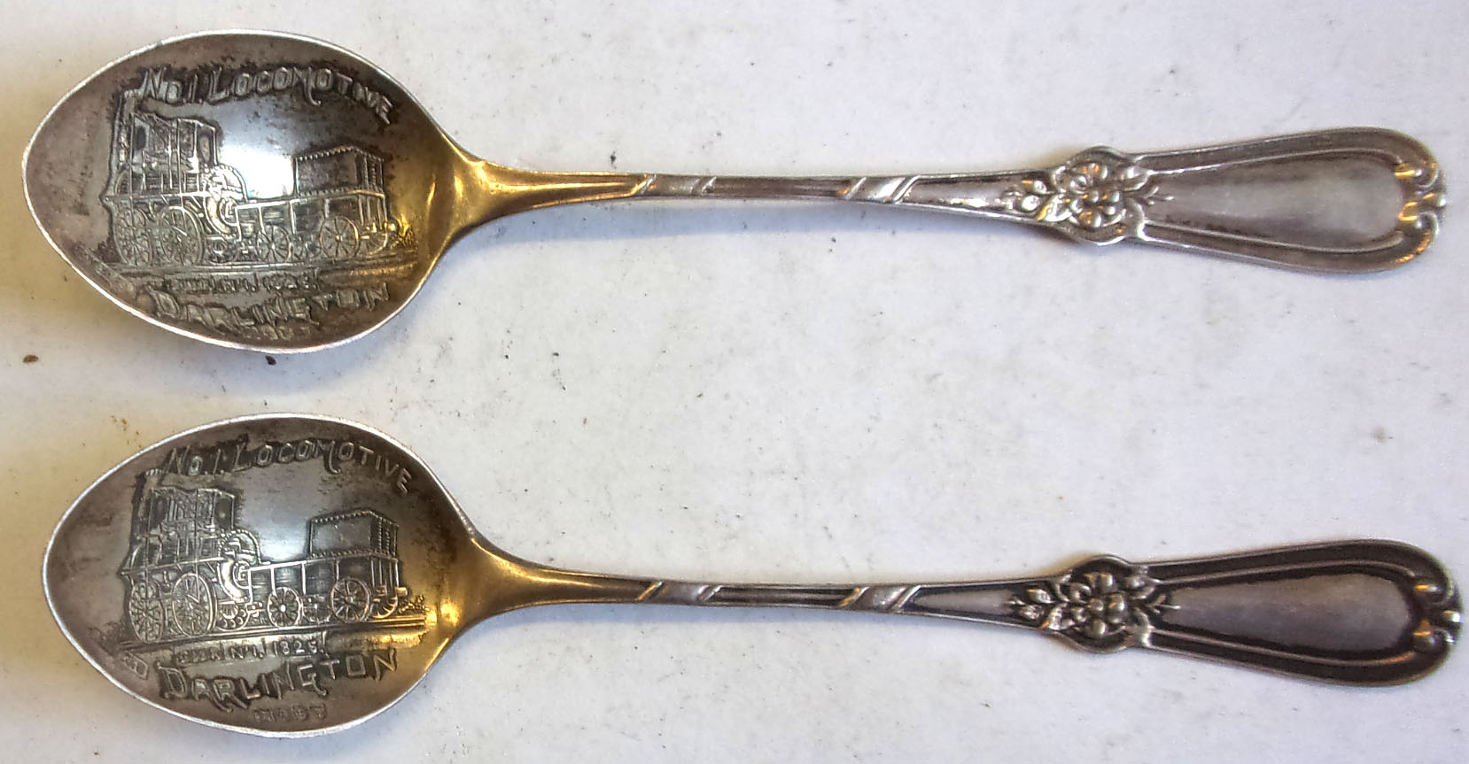 A pair of ornate E.P.N.S tea spoons ref to the Stockton & Darlington Rly very nice items.