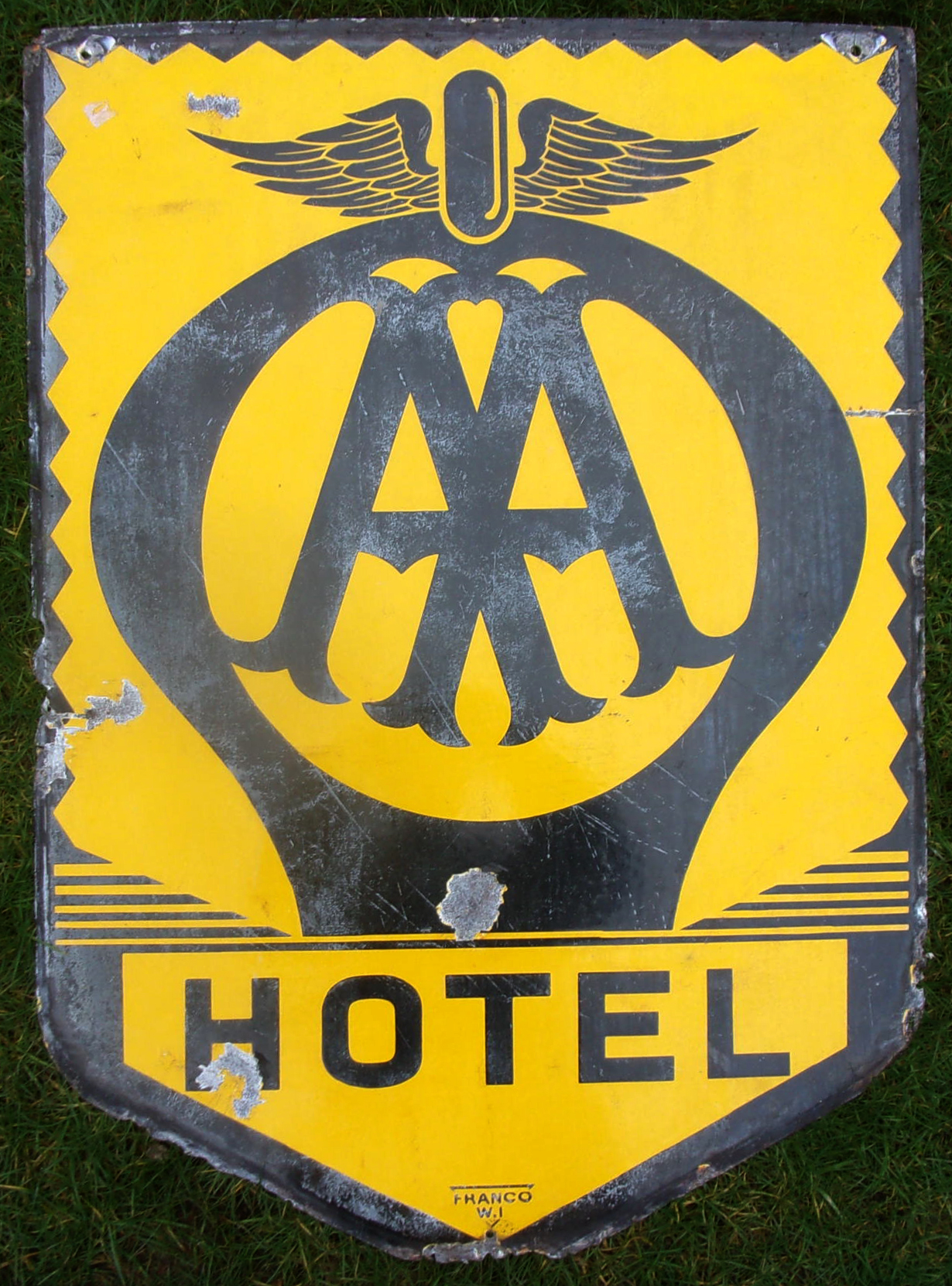 “Automobile Association Hotel” enamel sign. Good colour & shine, little metal loss to bottom point, some small loss of enamel. 22″ x 30″.