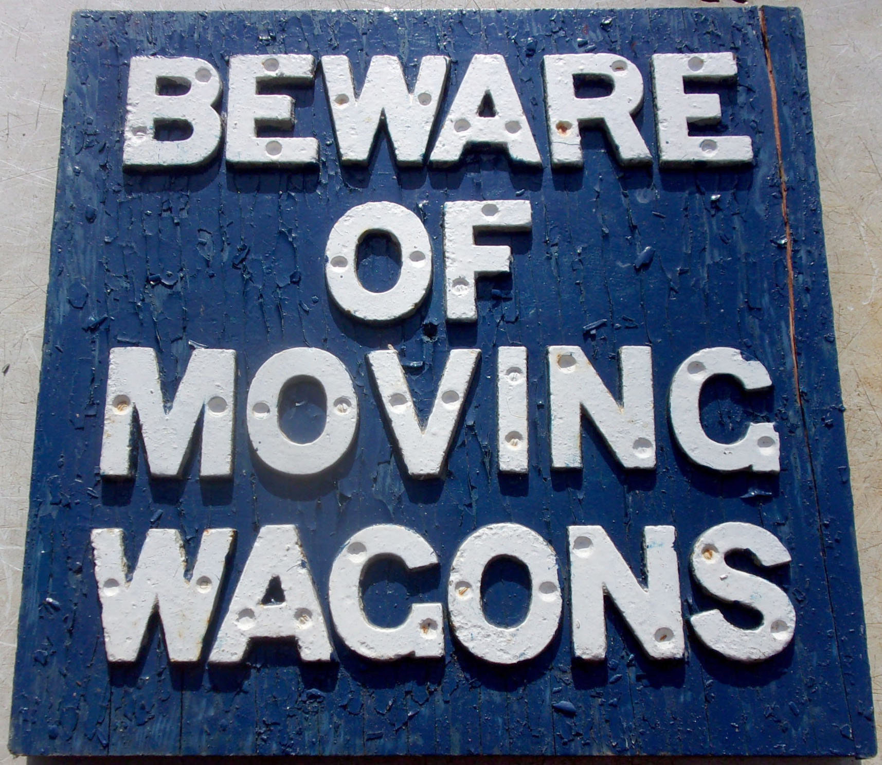“Beware of Moving Wagons” sign. Probably L&NWR origin. Wooden board with metal letters. 18″ x 18″.