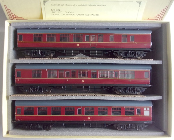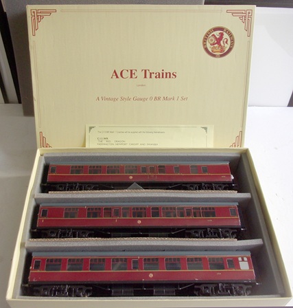 BOXED SET OF ACE TRAINS – 0 GAUGE, BR MARK 1 COACHES. Mint unused condition. ( 2 x images to view)