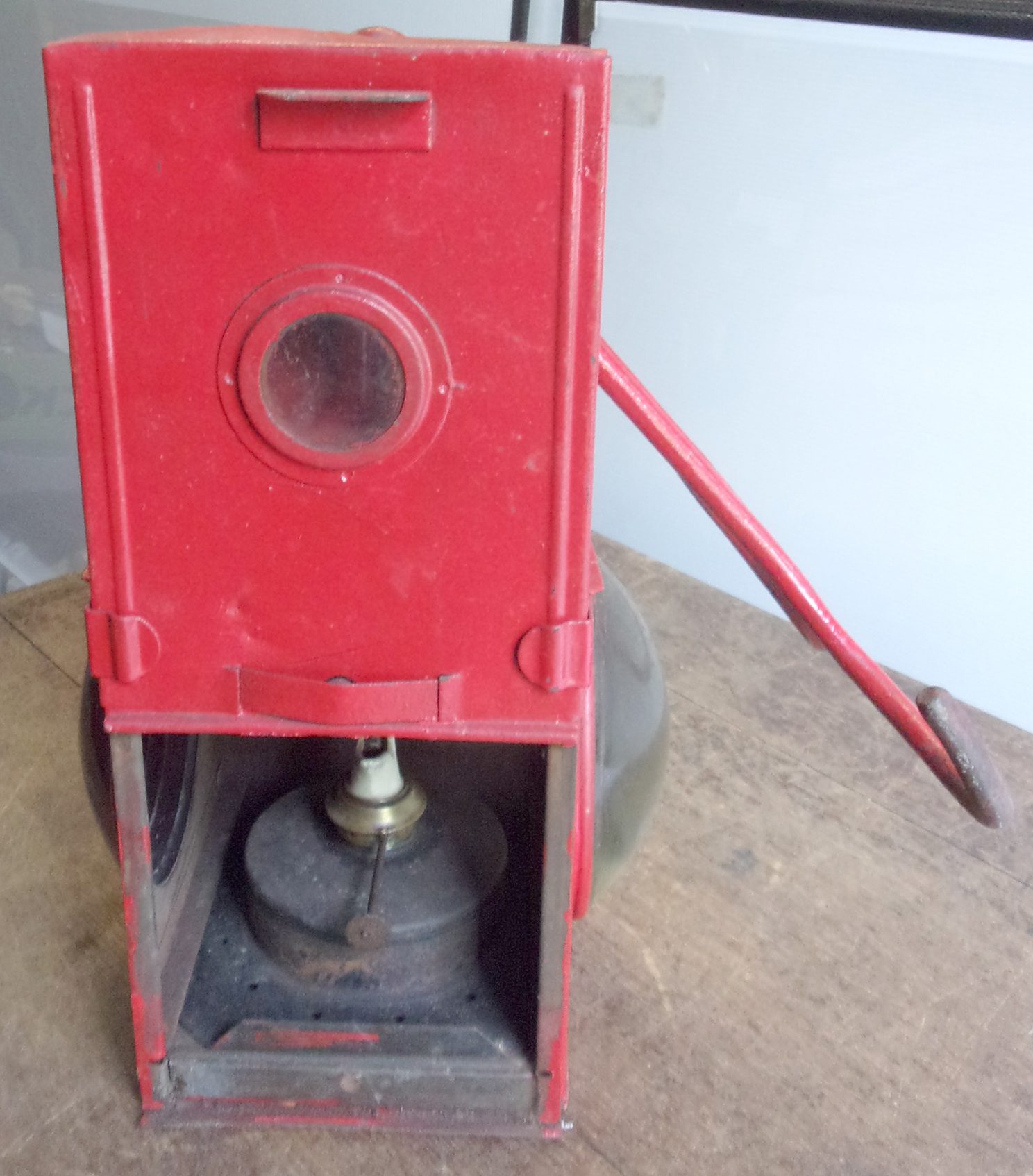 BR Splitter Lamp with vessel & burner “BR” embossed to chimney. 2 x red bullseye, 1 x clear bullseye. Scratches only from uses.