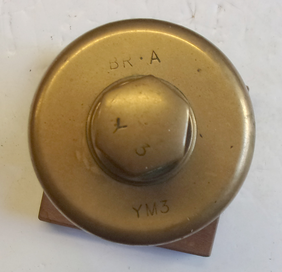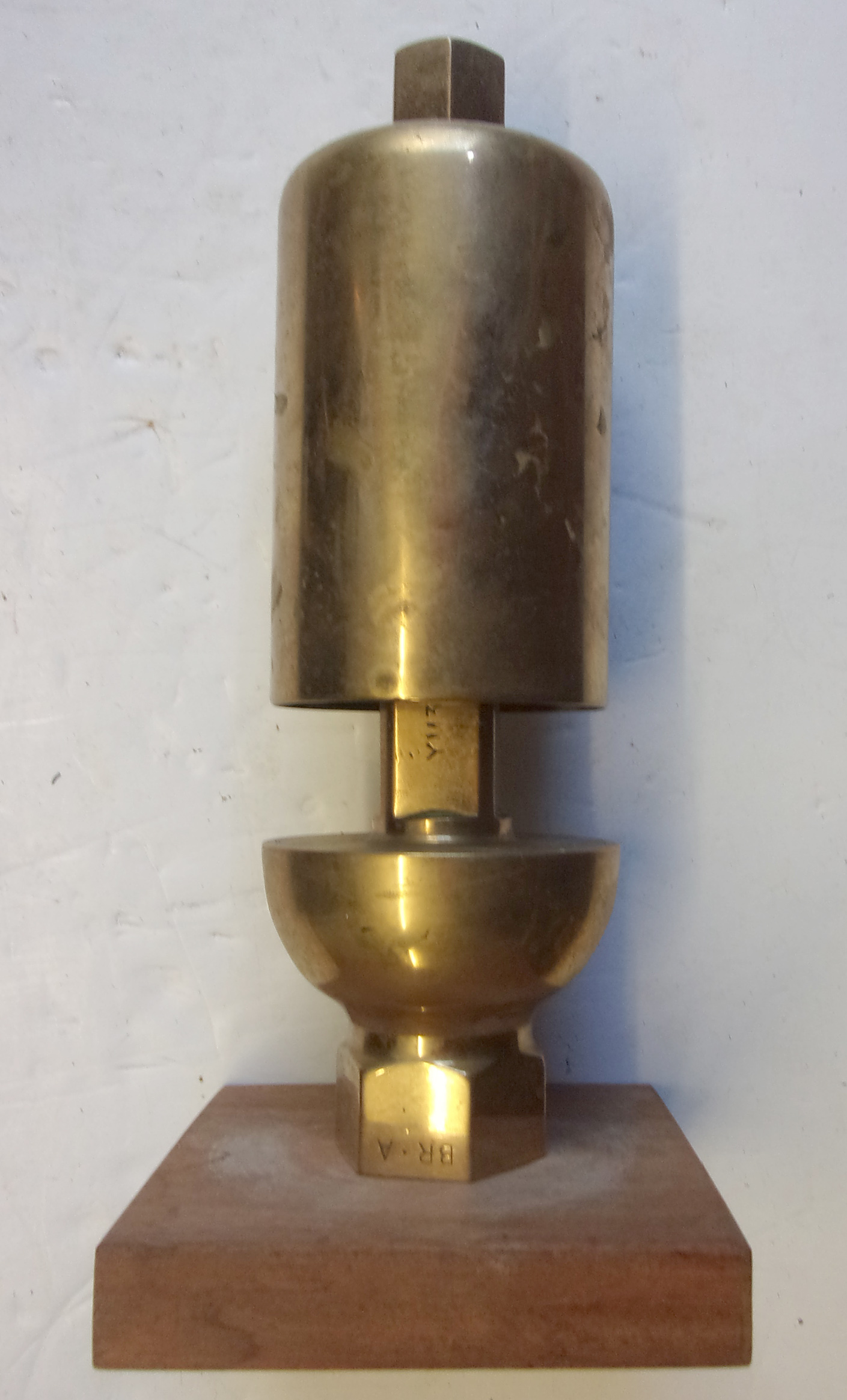 BR Standard Loco Whistle, lightly polished, displayed on mahogany stand “BRA” “YM3” “4” stamped. V.g.c.