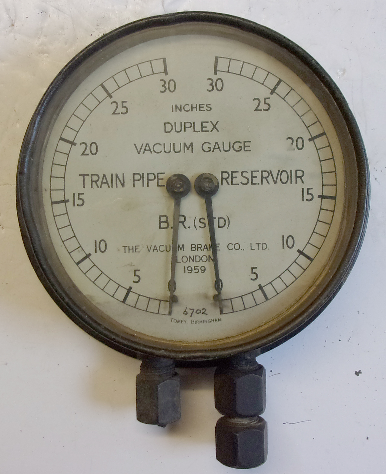 BR Standard Pressure Gauge, face written “Duplex Vacuum Gauge Train Pipe Reservoir BR(STD) 1959”. Brass case 6″ diameter as pictured. 2 x pictures to view.