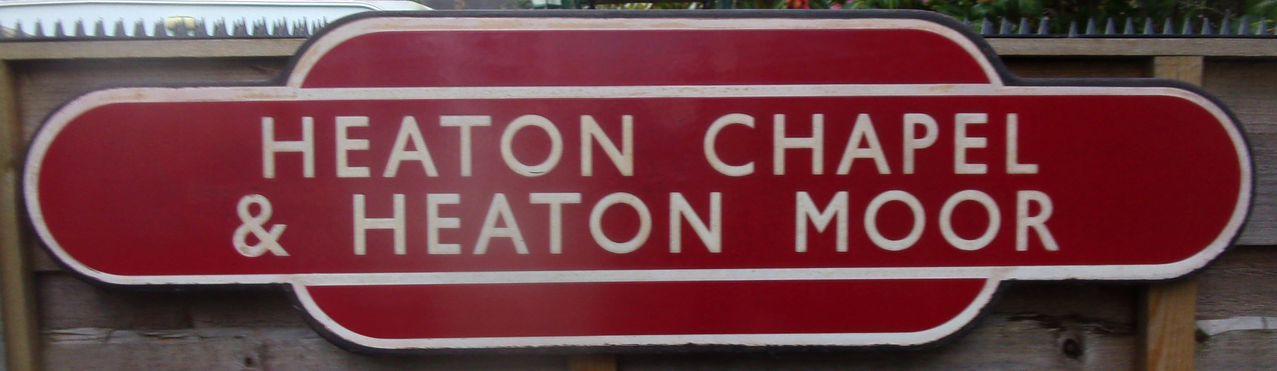 BR Station Totem enamel sign “HEATON CHAPEL & HEATON MOOR” (M) FF. Good colour & shine, edge nibbles only. Located on the London to Mancheser main line. Approx. 6 miles east of Manchester, London Rd, Station.