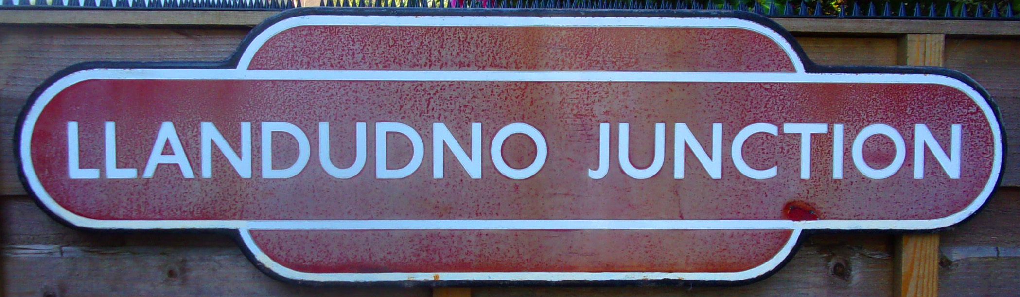 BR(M) FF enamel Totem Station Sign “Llandudno Junction”, located on the North Wales Main Line from Crewe to Holyhead, situated at the junction to Llandudno, also to Betws-y-Coed. Mottled with small chip repair to right hand bottom edge. Little oil wiped over will bring the colour & shine back lovely.
