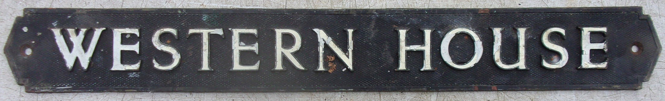 Cast embossed brass door plate “Western House”. In need of a good clean, will look superb when done. 18″ x 2 1/4″. Has engine turned ground.