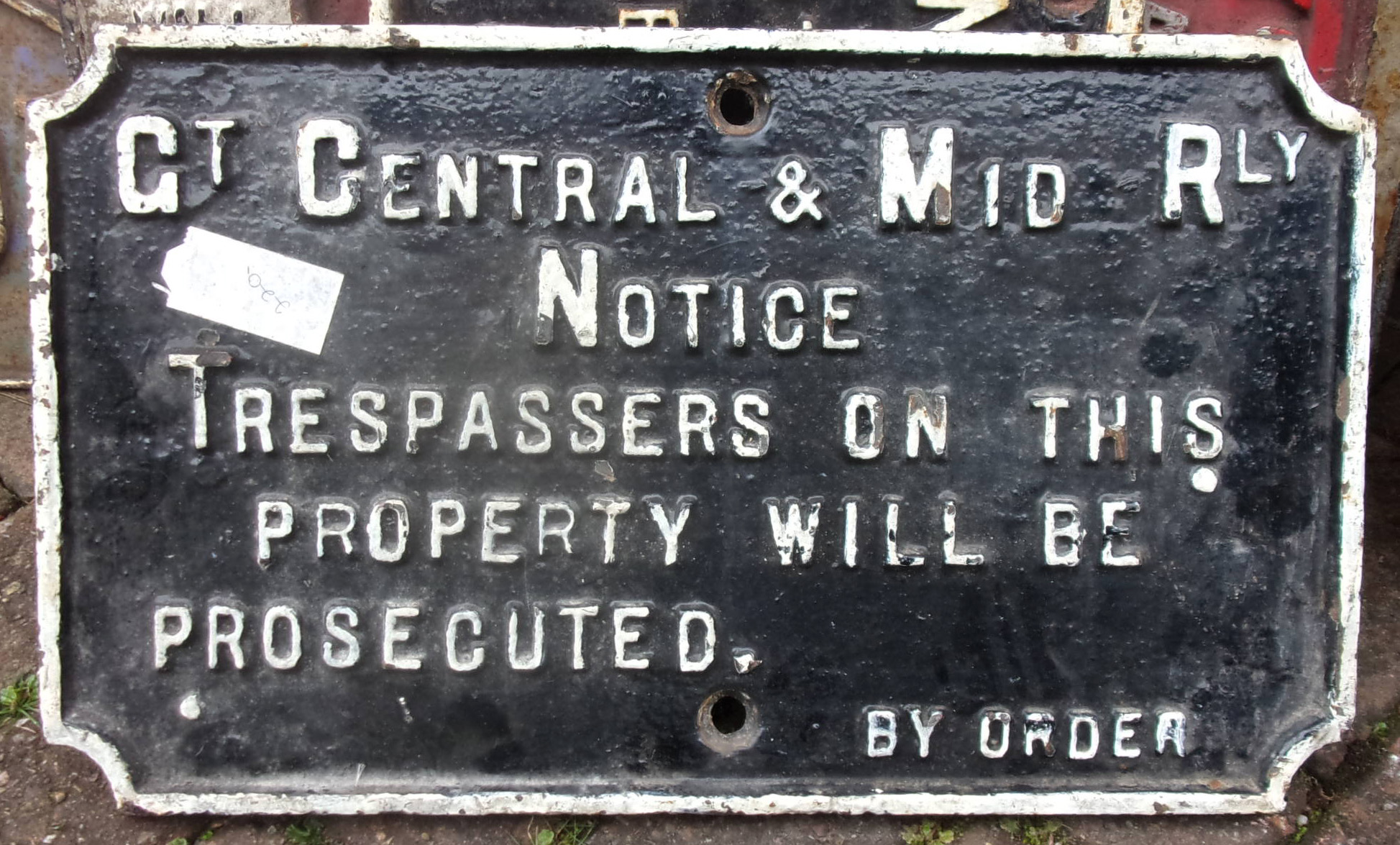 Cast iron sign – Gt Central & Mid Rly Notice Trespassers on this property will be prosecuted by order”. Sound condition. 20 1/2″ x 11 5/8″