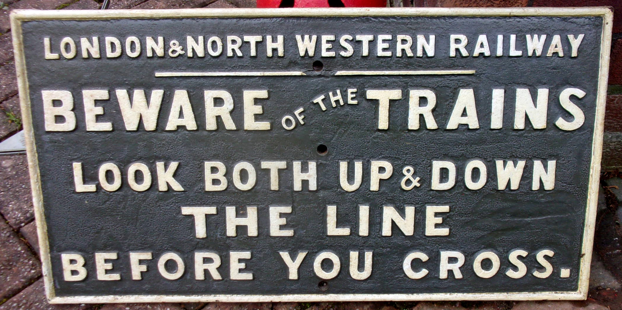 Cast iron sign “London & North Western Railway “Beware of The Trains”. Repainted face, 28 3/4″ x 15″.