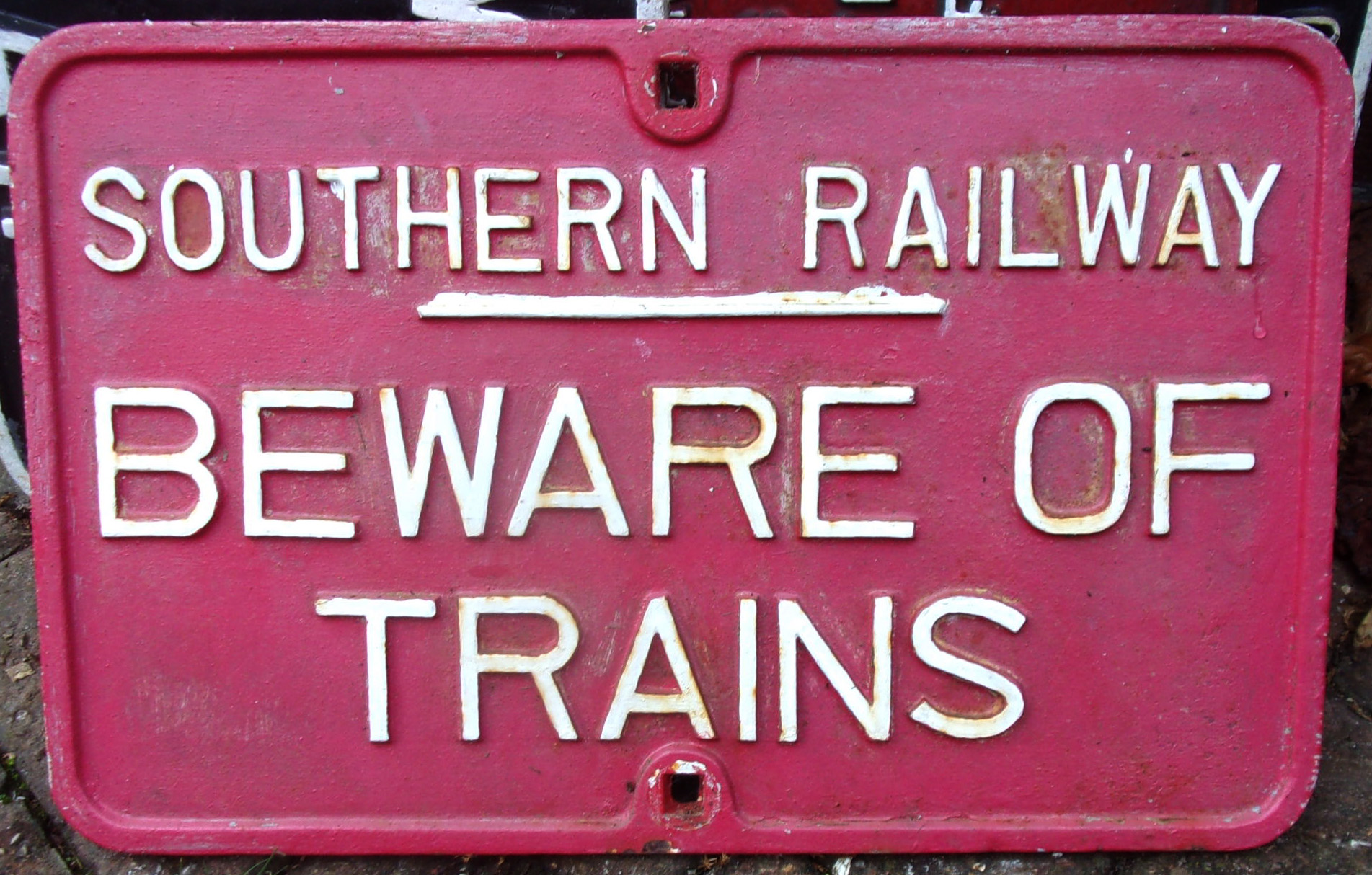 Cast iron sign “Southern Railway Beware of Trains”. Repainted, sound condition . 26″ x 16 1/2″.