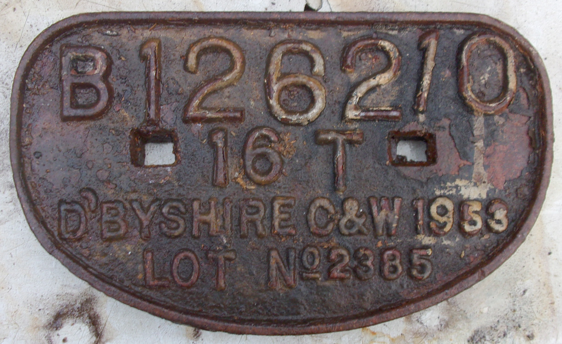 D Wagon plate “D’Byshire C&W 1953 Lot No. 2385 16T B126210”, ex wagon.