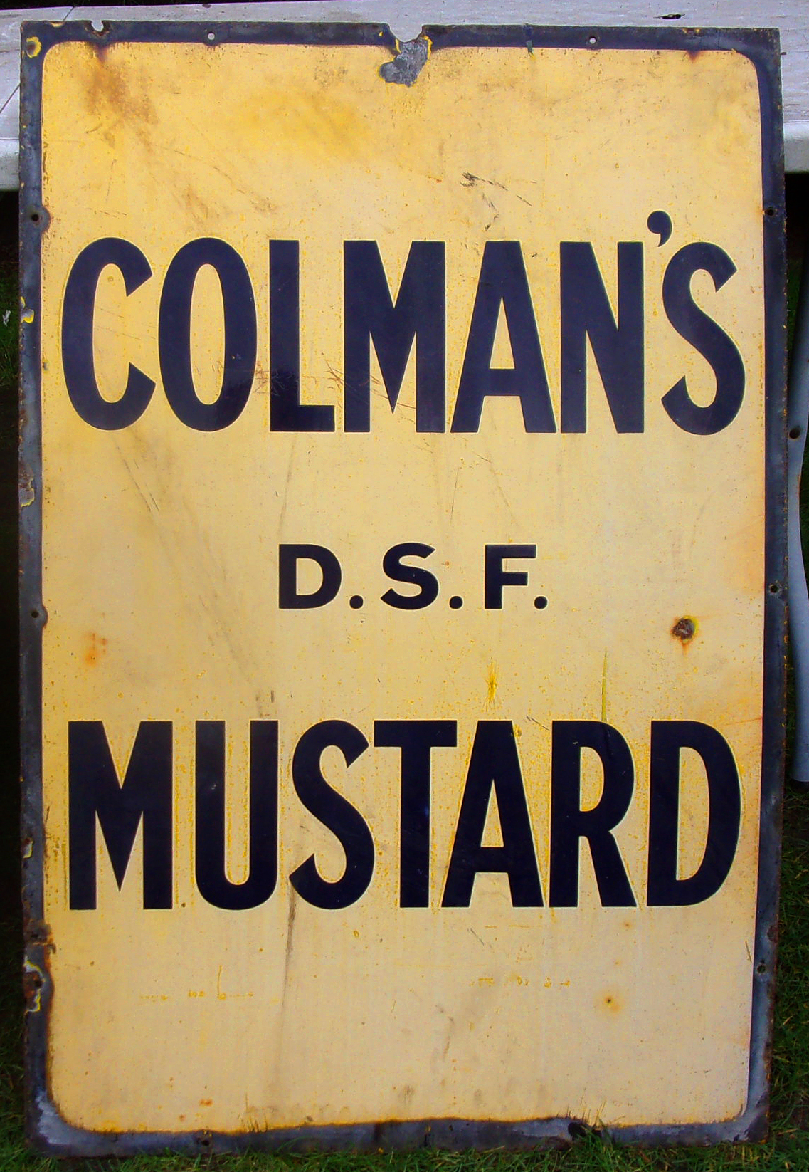Enamel Advertising Sign “Colmans D.S.F Mustard”. Has edge loss in places. Enamel faded a little. 24″ x 36″.