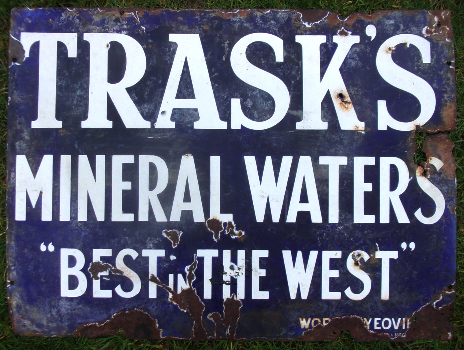Enamel Advertising Sign “Tasks Mineral Waters Best In The West Works Yeovill”. Good colour & shine, considerable loss of enamel, but legend 95% in tact. A rare enamel dating from the 1930s.