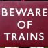 Enamel Sign “Beware of Trains”. Very good condition overall, a little dull. Edge chips, do not detract. 24″ x 18″.