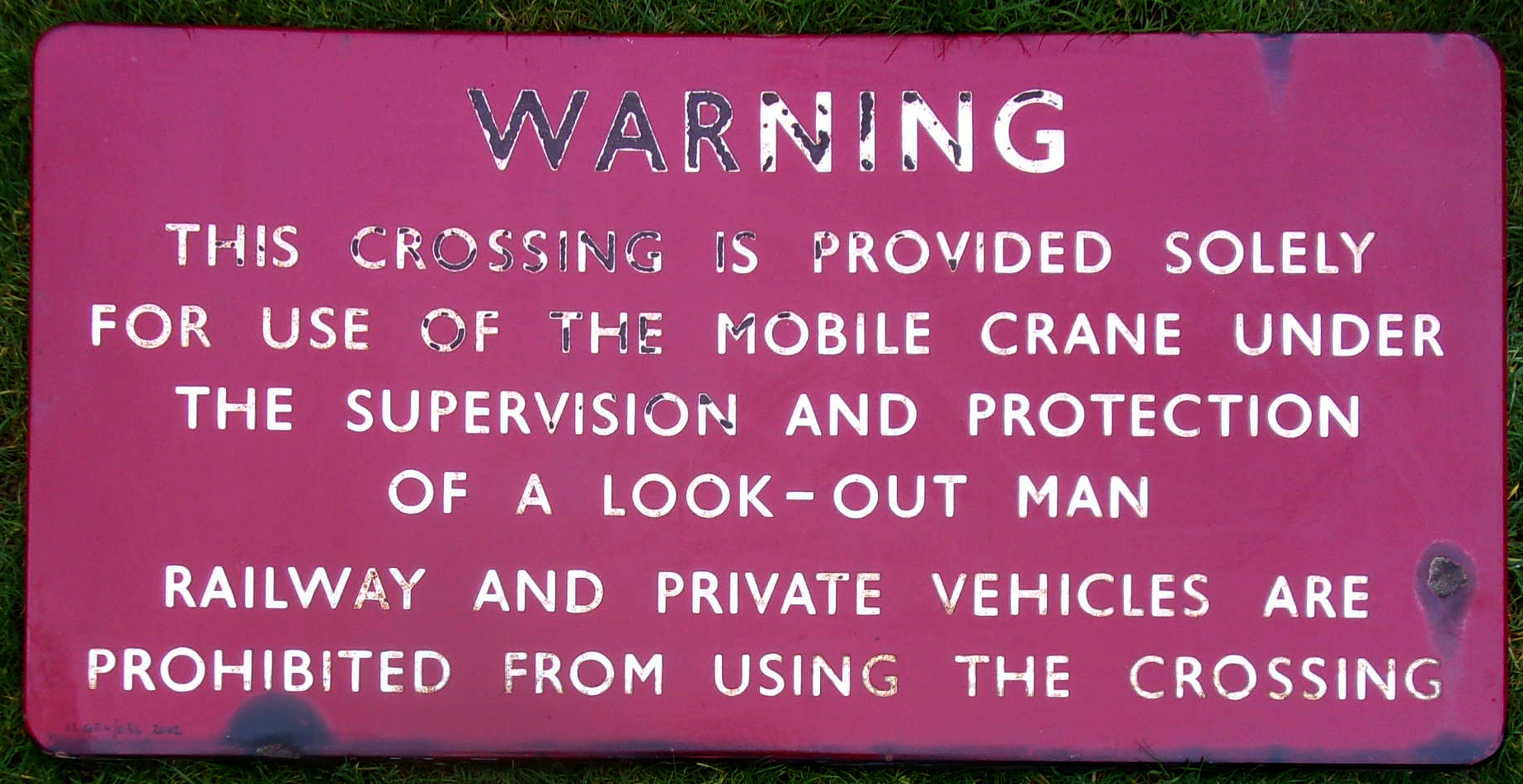 Enamel Sign “Warning” BR(M), ref. to crossing the line safely for mobile crane etc.” Good colour, but some loss to letter enamel. Otherwise, sound, no holes etc. 36″ x 18″.