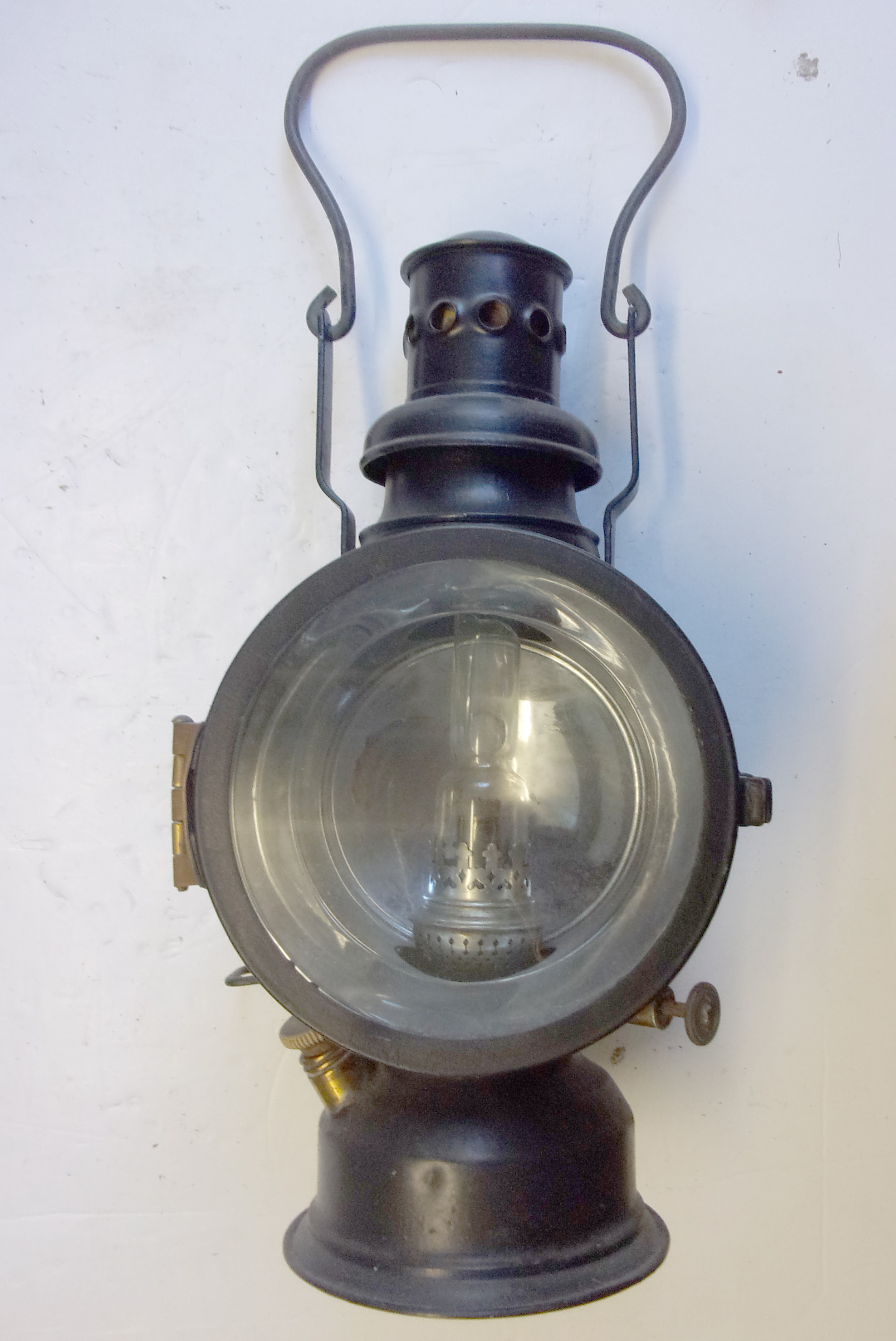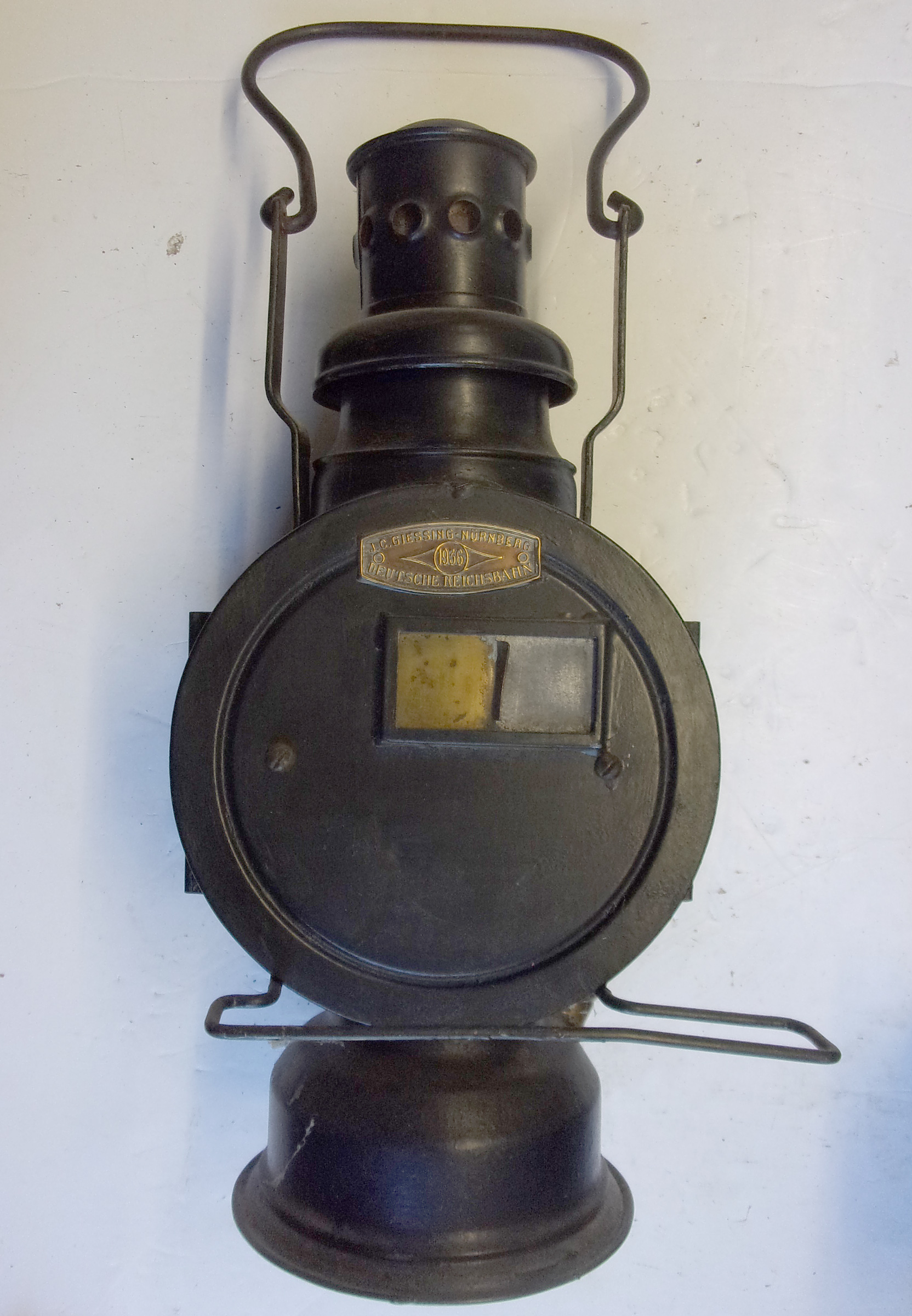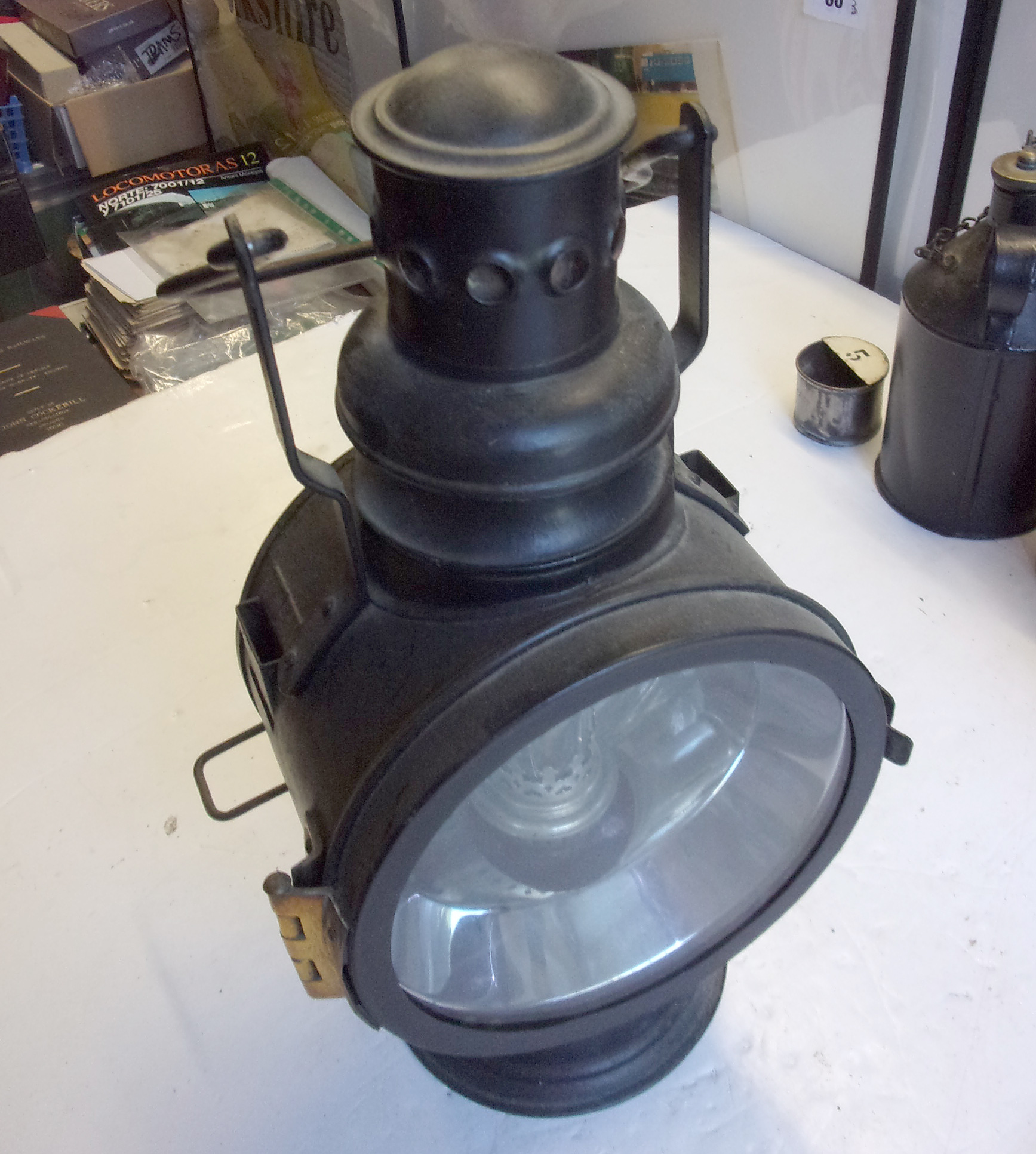 German Loco Headlamp, in lovely condition. Totally complete, as pictured. 15″ high, excluding the handle. Makers plate to body.