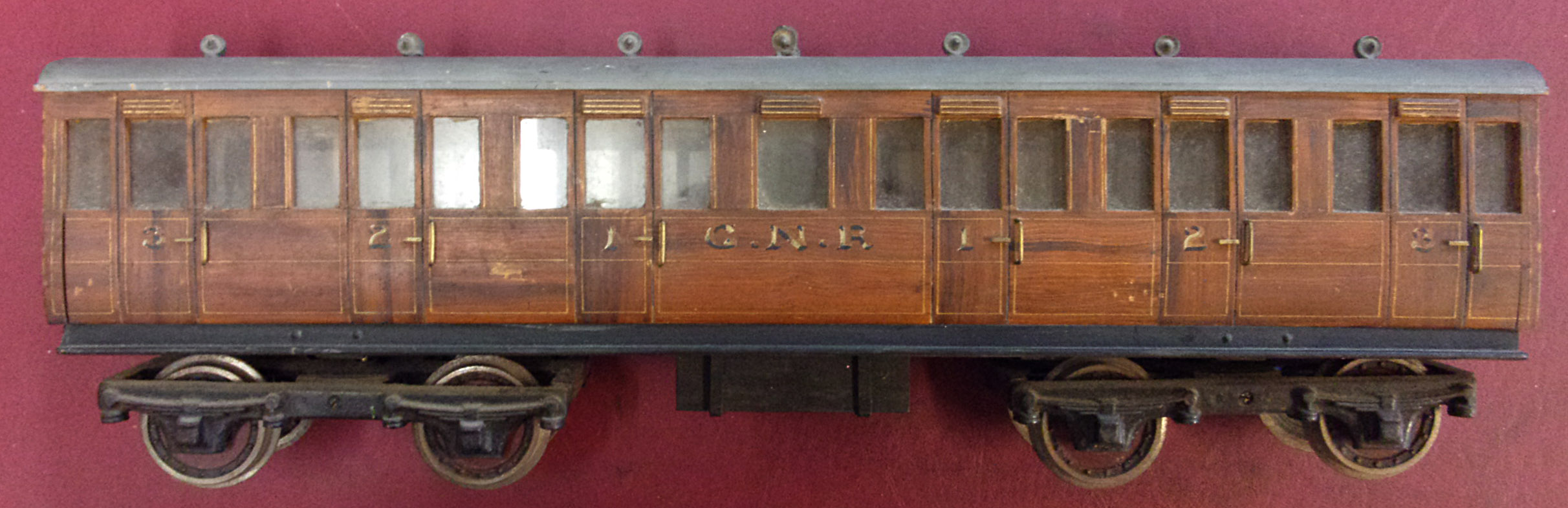 GNR Coach 1 3/4″ gauge, wooden construction with cast iron bogies, steel wheels, very solid. In perfect condition. 18 1/2″ in length. ( 2 x images to view)
