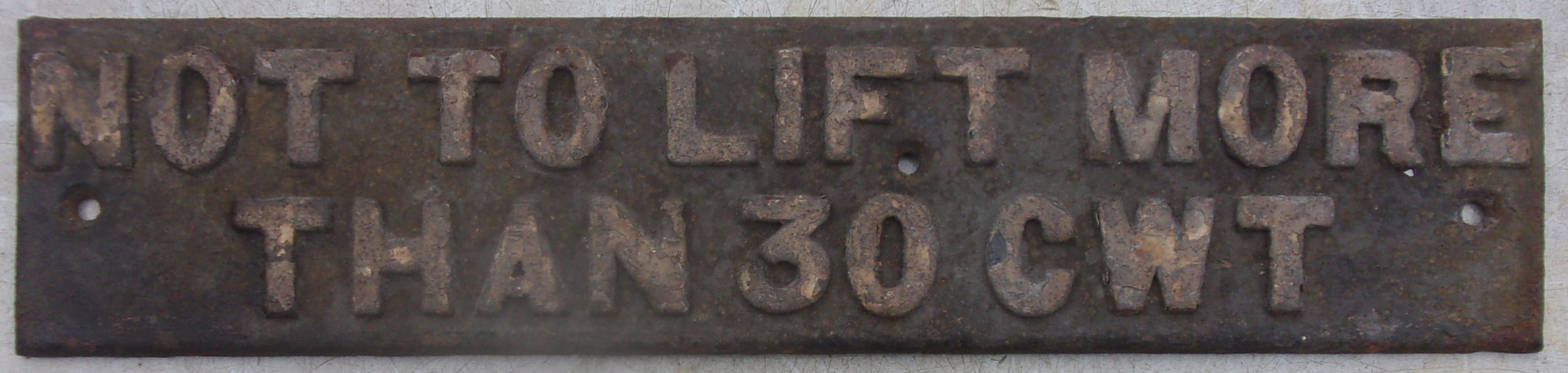 Goods Yard cast iron Crane Warning Plate “Not to lift more than 30 CWT”. Ex crane condition. Sound. 23″ x 5″.