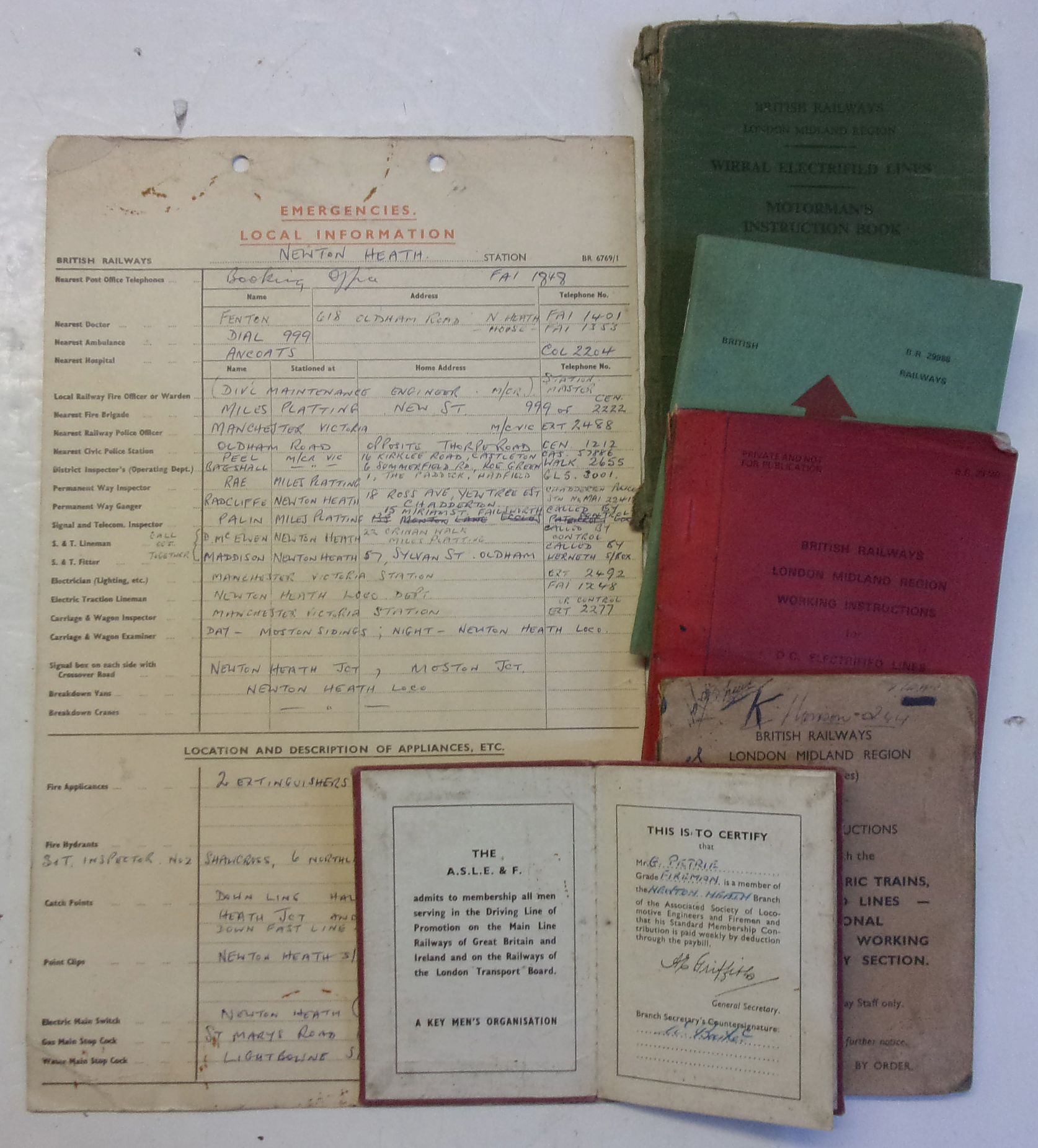 Group of Booklets etc, including ASLEF Membership Card for G Petrie Fireman off Newton Heath Loco Dept, plus card info for Newton Heath.