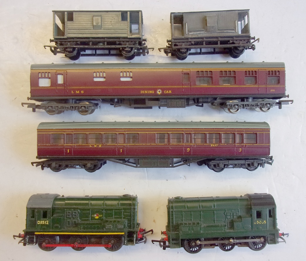 Group of OO models, 2 x carriages, 2 x brake vans, 2 x shunters by Triang.