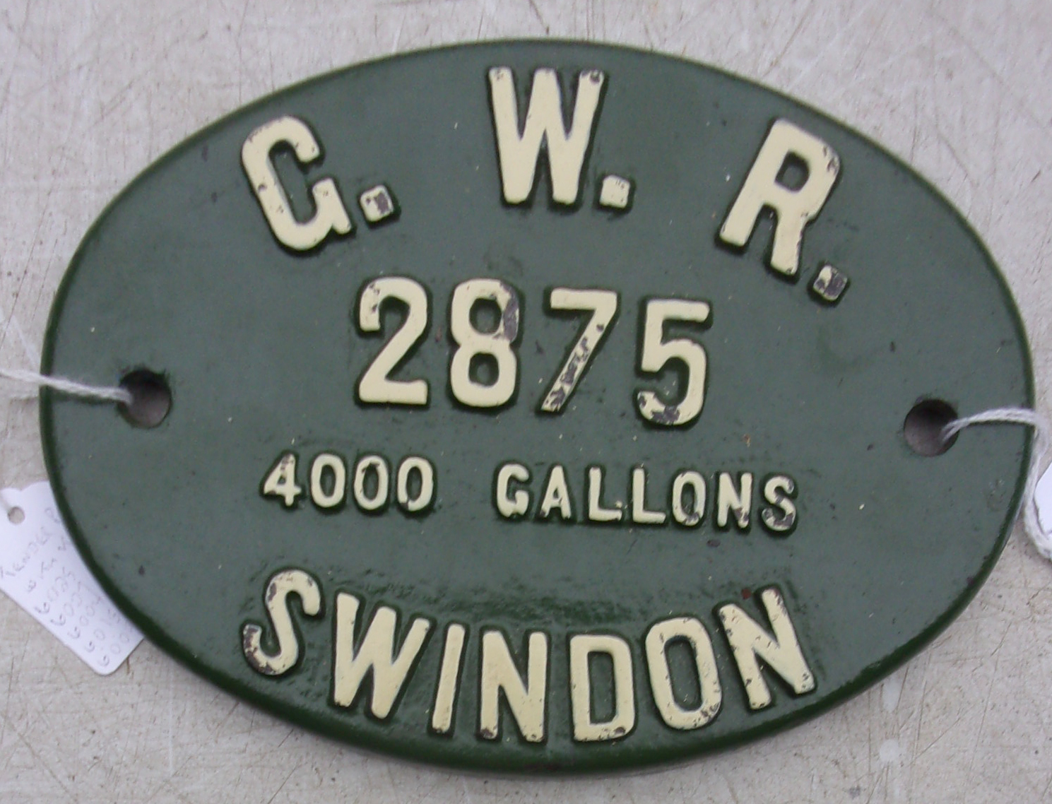 GWR Tender Capacity Plate, retrieved for tender attached to King Class “6003 King George 1V”. Built Swindon Works in 1927, allocations to Old Oak Common, withdrawn in 1962. Cast iron, repainted face, ex loco back with reference to loco.