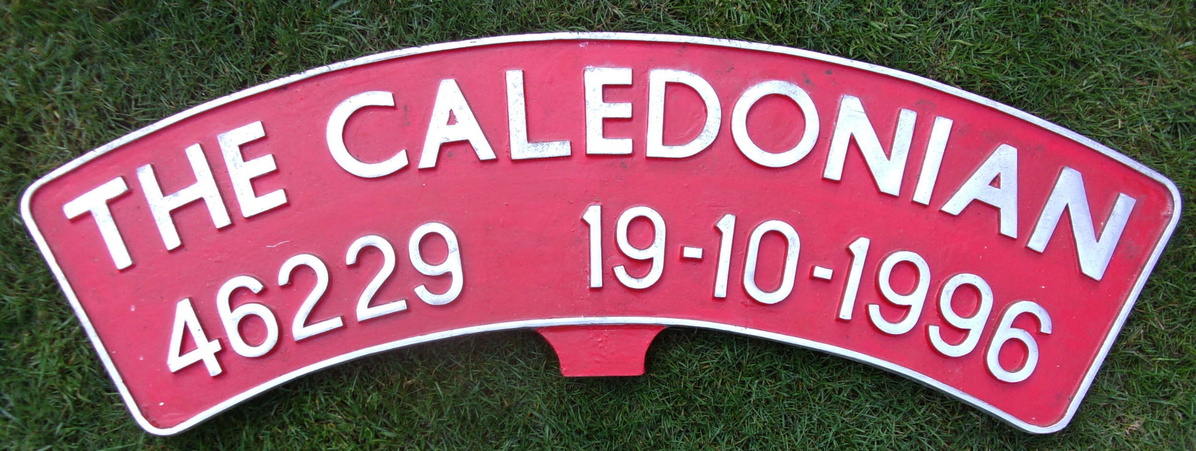 Headboard “The Caledonian 46229 19-10-1996″ full size cast aluminium, carried by 46229 Duchess of Hamilton on this rail tour. Superb condition. 40″ x 12”.