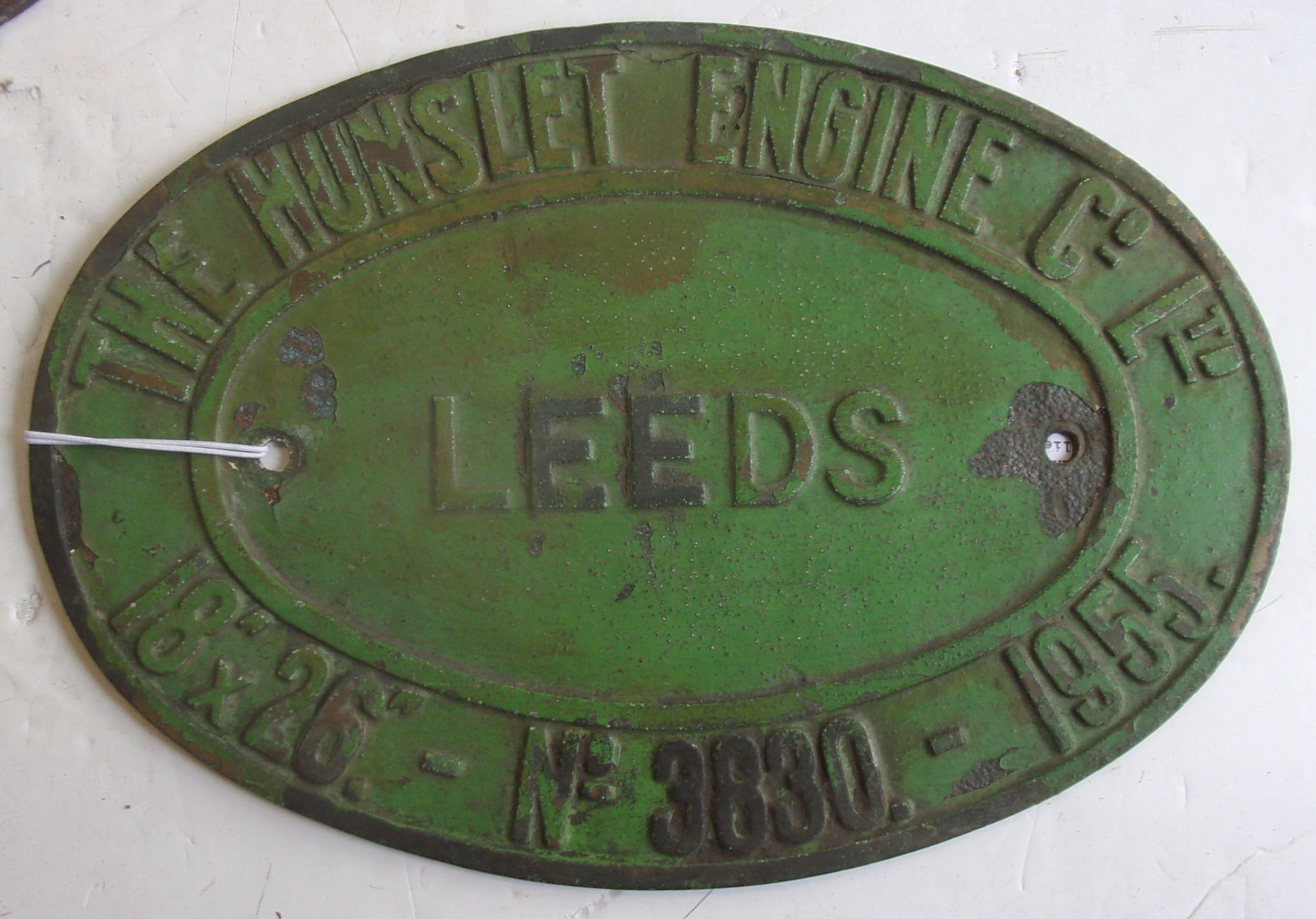 Industrial Loco Worksplate “The Hunslet Engine Co. Ltd Leeds. 18″ x 26″ – No. 3830 – 1955”, as carried by 0-6-0 Saddle Tank, named “Hurricane”. Supplied new to Parsonage Colliery, Leigh. Moved later to Bickers Colliery. Withdrawn and scrapped in 1981.