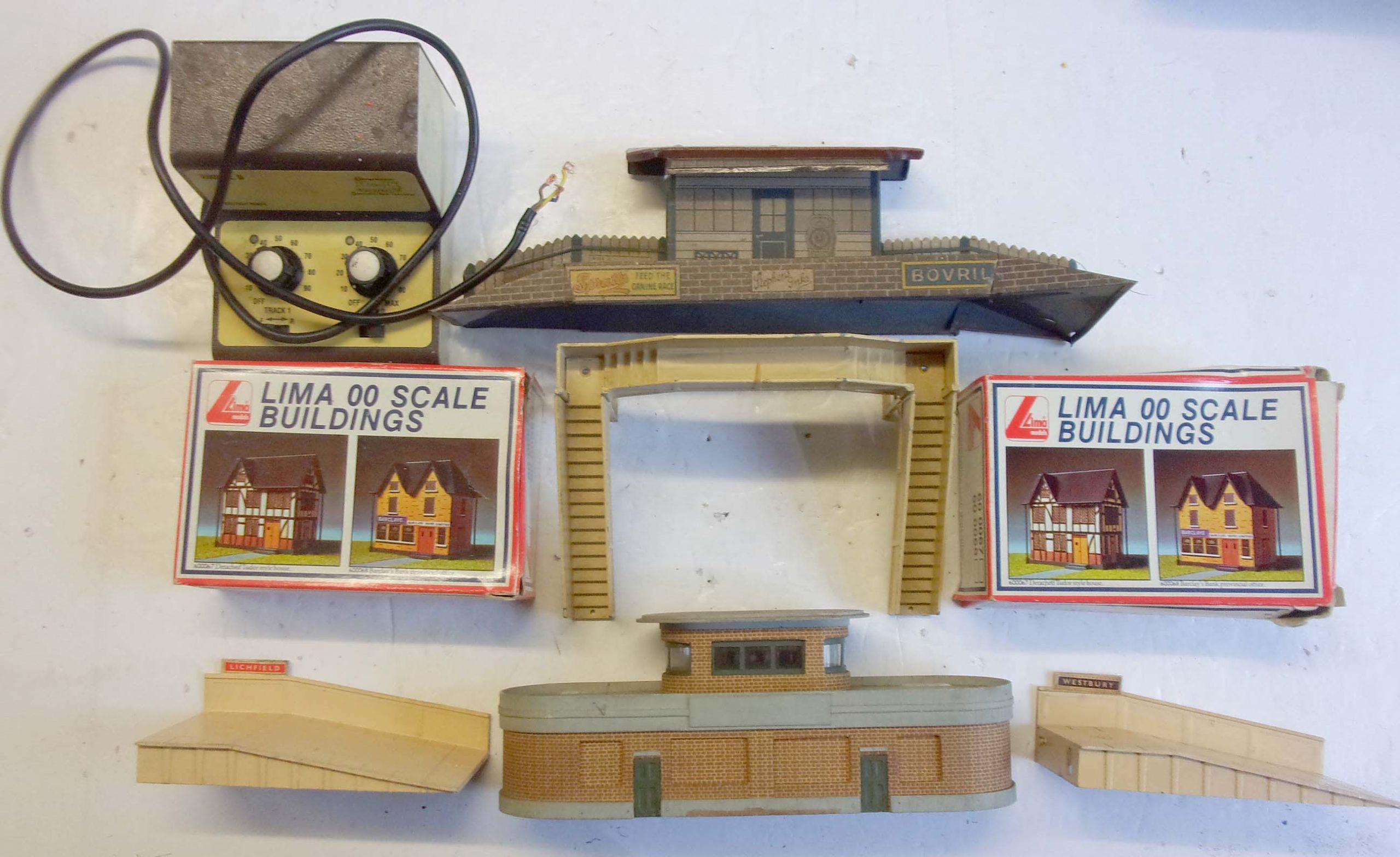 Job Lot Hornby Dublo Footbridge, 2 x Ramps, 2 x 00 Plastic Kits, O gauge station, wooden OO Gauge signal box.