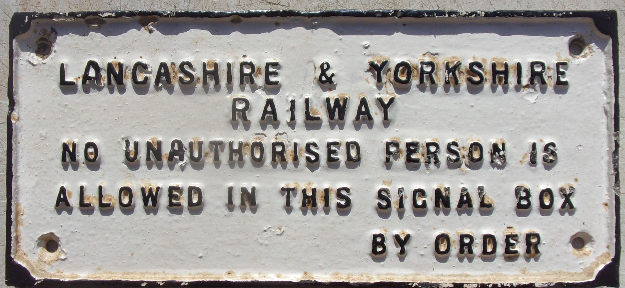 Lancashire & Yorkshire Signal Box Door Plate “No Unauthorised Person Is Allowed In This Signal Box”. Repainted face, removed from Horwich Station Box. 13 1/2″ x 6″. 2 x images to view.