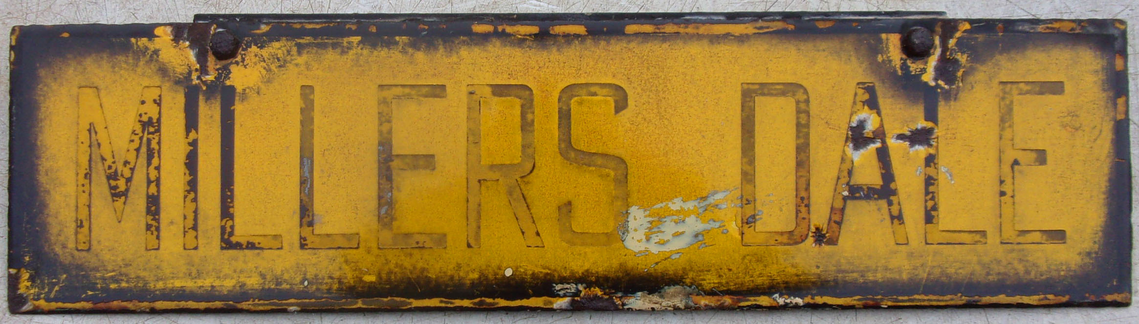 LMS Lamp Tablet “Millers Dale”, shows years of exposure to the harsh weather with the limestone quarrying in the air. Although faded letters, the blackness to the edges will remove with care. 17 1/2″ x 4 1/2″. Millers Dale was located in Derbyshire Limestone Hills on the Midland Mainline, at the junction for Buxton.