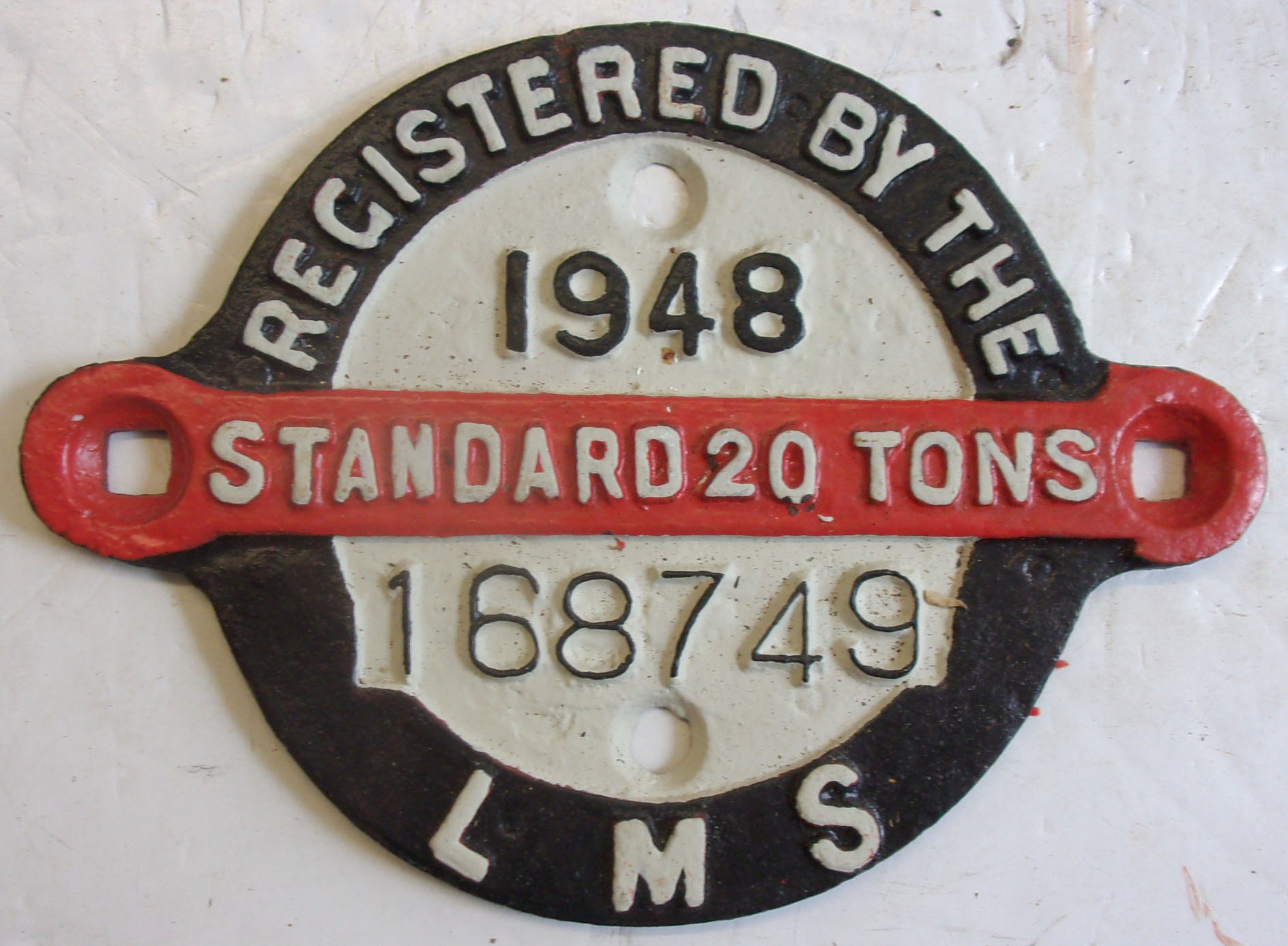 LMS Wagon Registration Plate, “Registered by the LMS 1948 Standard 20 Tons 168749”. Repainted. 6 5/8″ diameter.