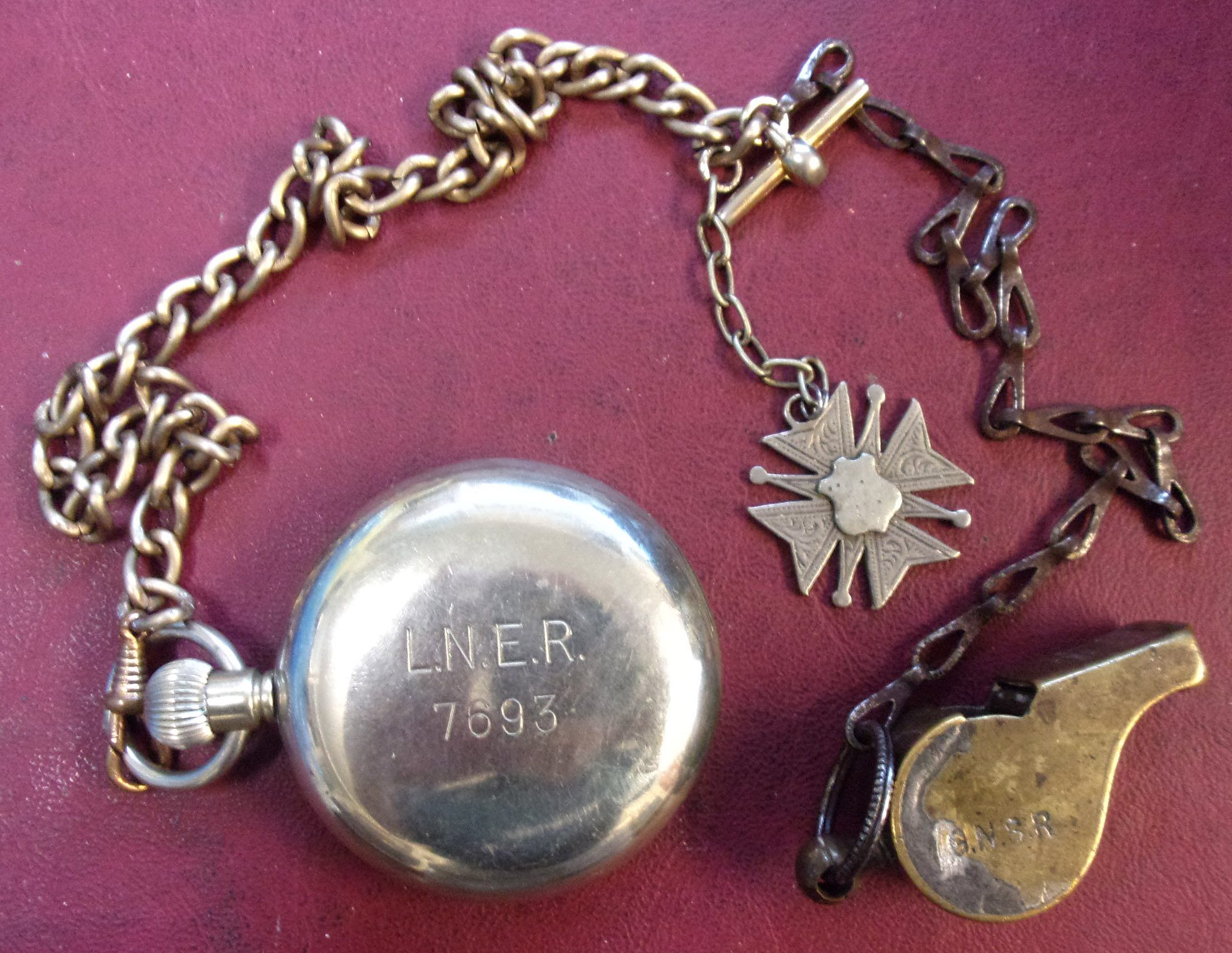 LNER Guards Pocket Watch engraved to back “LNER 7693”, with a Great North of Scotland Acme Thunderer Whistle and Chains, accompanied by unrelated Maltese Cross Fob.