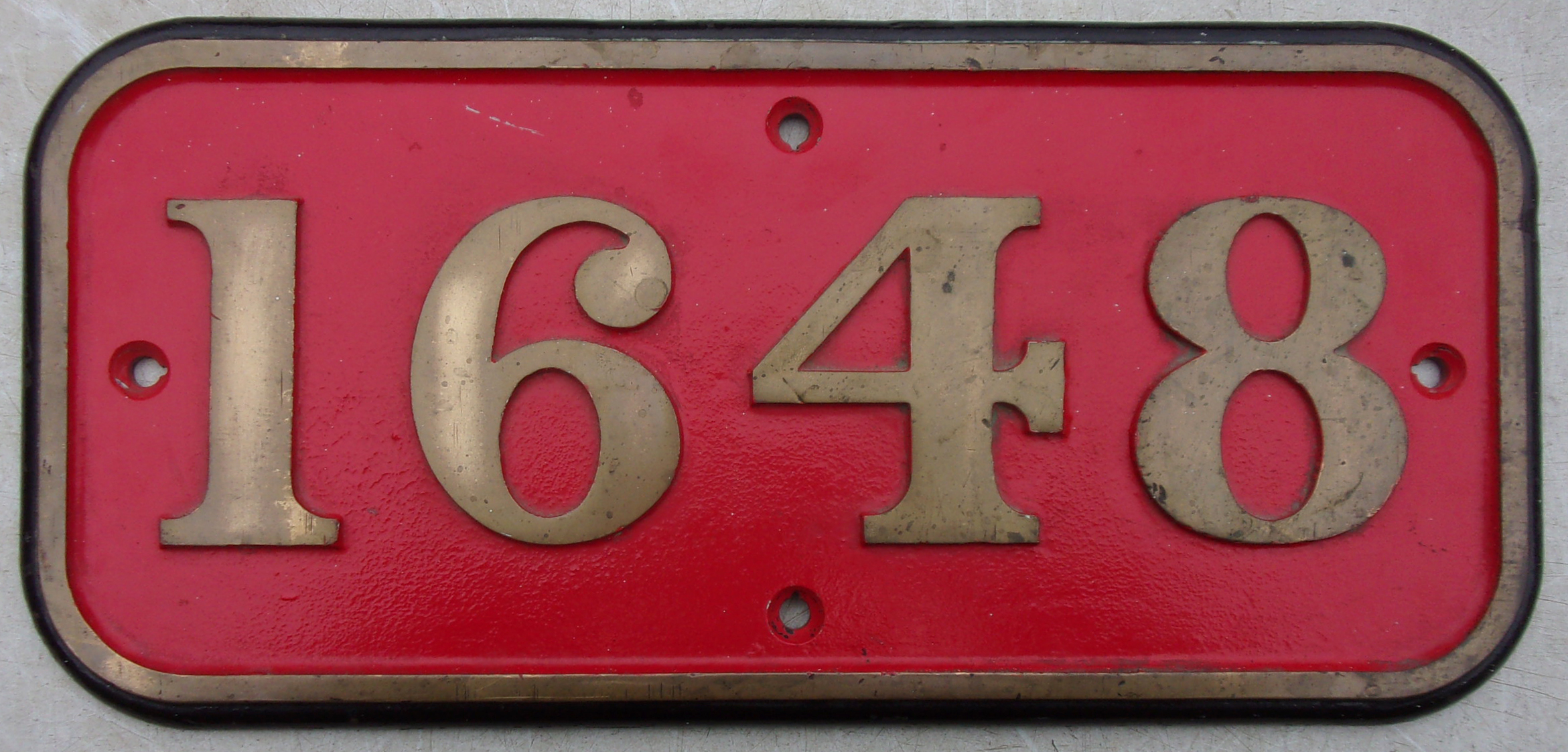 | Locomotive Cab Notice Numberplate “1648”, as carried by Hawksworth 1600 Class Pannier Tank built Swindon Works 1951. Allocations included Swindon, Danycraig, Carmarthen, Neyland. Withdrawn 1963. Cast brass, repainted face. Ex loco back. 2 x pictures to view. |