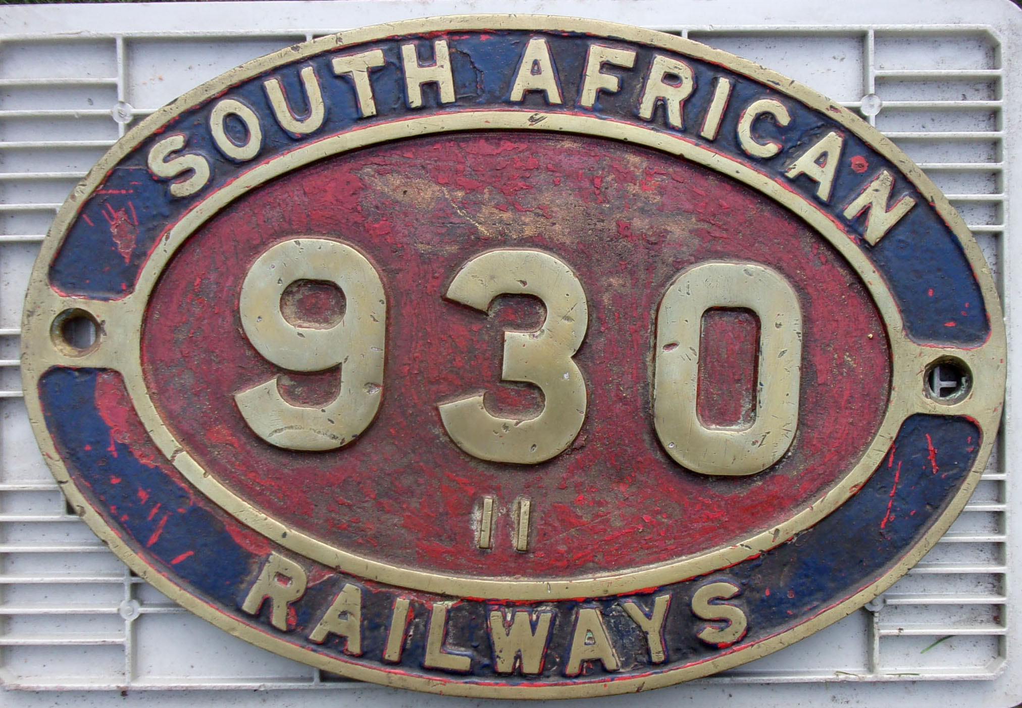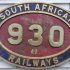 Locomotive Cabside Numberplate “South African Railways 930 11″, as carried by Class 11 2-8-2, built by North British Loco Co. in 1904. Embossed cast brass, ex loco condition. 20 3/4″ x 14 1/2”.