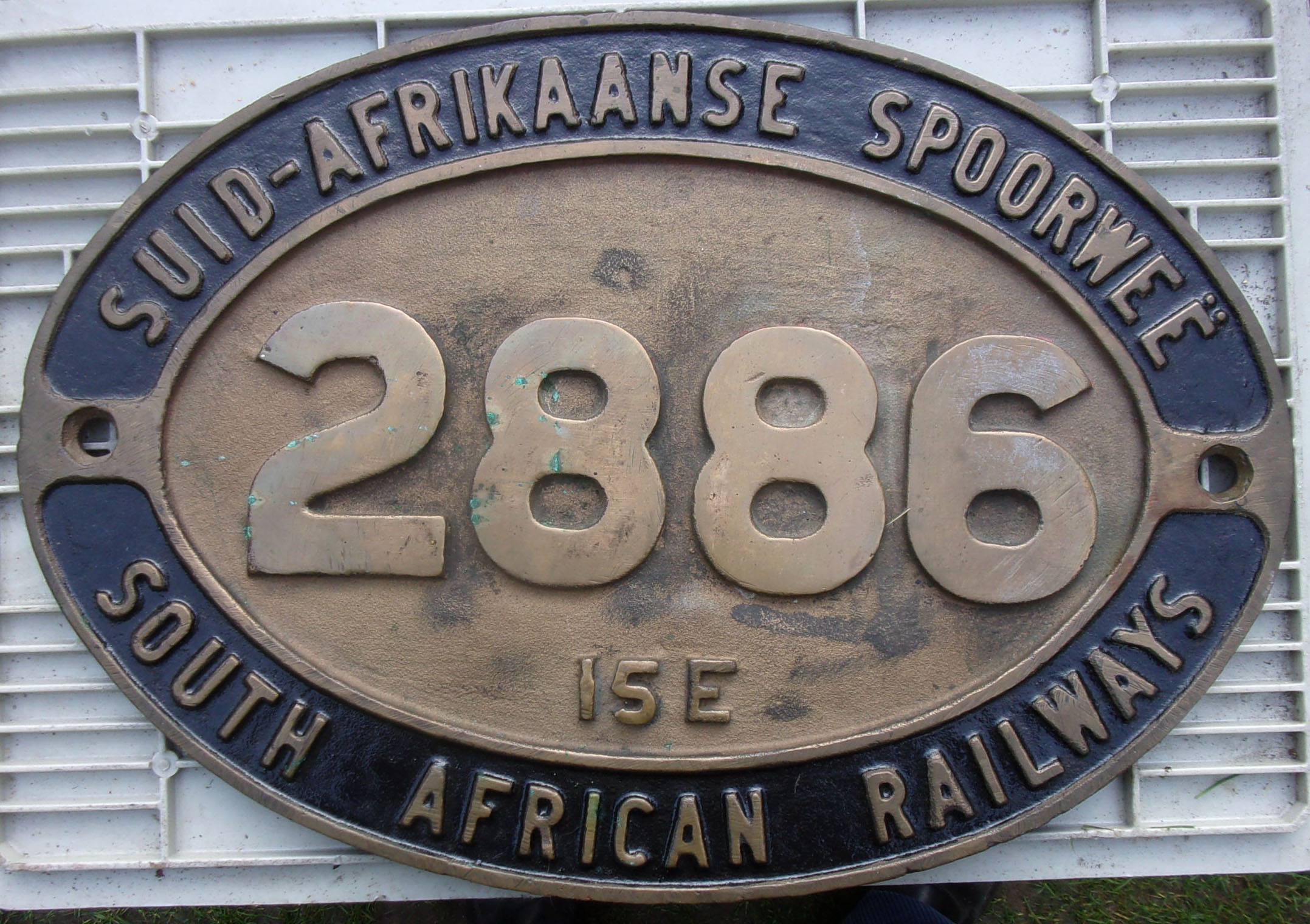 Locomotive Cabside Numberplate Suid-Afrikaanse Sporwee South African Railways 2886 15E”, as carried by Class 15E 4-8-2 Mountain Type. Built by Henschel 1936. Embossed cast brass 20 3/4″ x 14 1/2″. Ex loco condition, 2 x images to view.