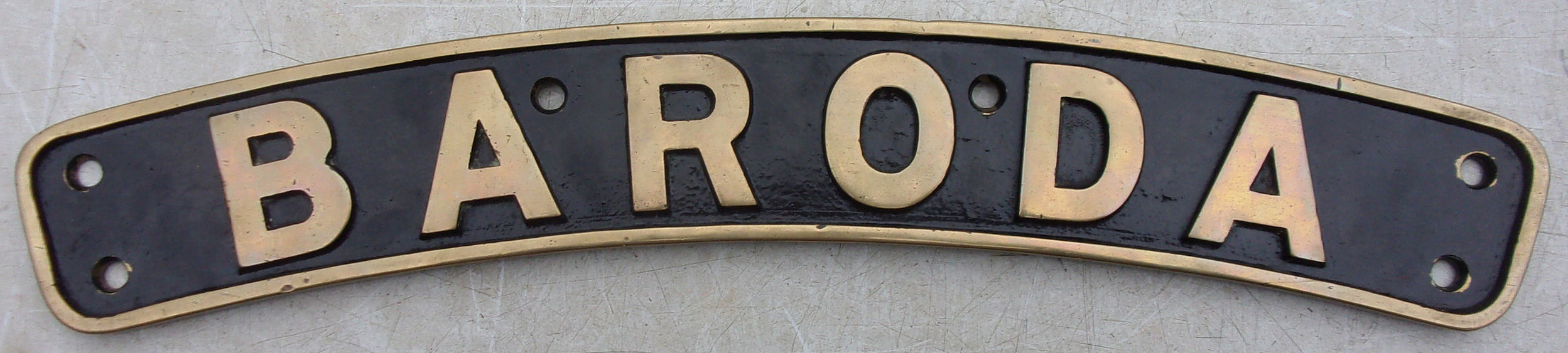 Locomotive Nameplate “BARODA”, as carried by Stanier Jubilee Class 45587. built North British Loco Co. Glasgow. Emerging to service December 1934. Allocations included Holbeck, Crewe N, Longsight, Preston, Bushbury, Carnforth. Withdrawn in September 1962. Cast brass, repainted face. Ex loco back, two pop mark depict. 2 x pictures to view.