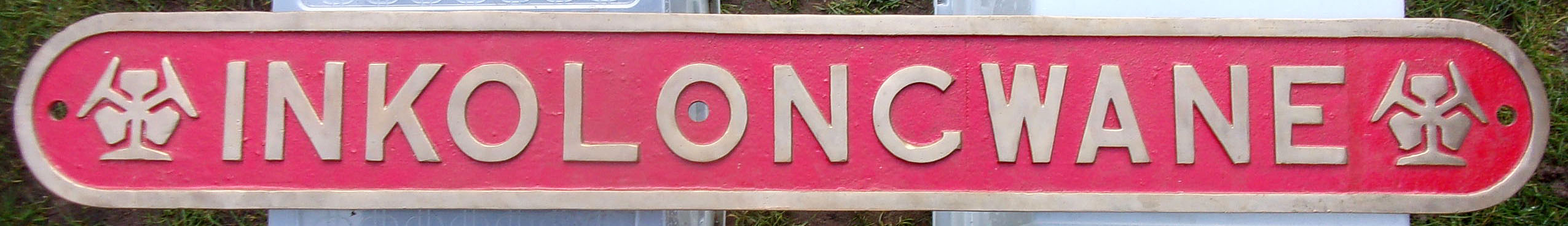 Locomotive Nameplate “INKOLONCWANE”, as carried by Rhodesia Rly 15th Class Garratt Loco number 371, built by Beyer Peacock, Manchester 1948. Repainted lightly polished face, clean ex loco back. Embossed cast brass.
