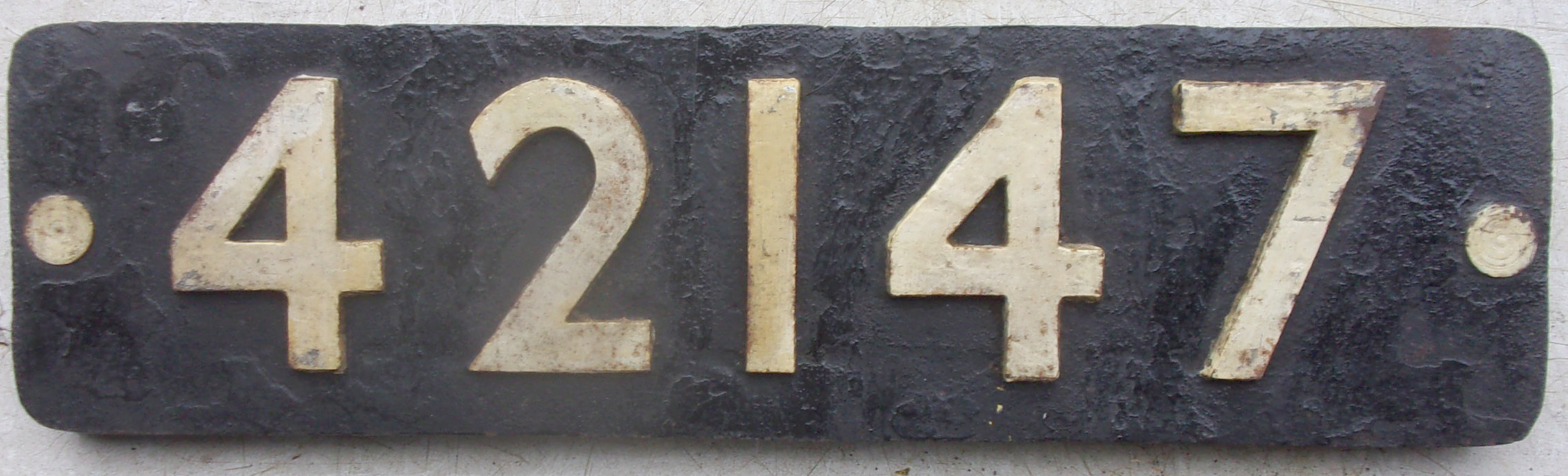 Locomotive Smokebox Numberplate “42147”, as carried by Fairburn 2-6-4 Tank Loco, built at Derby in 1948. Allocations included Fleetwood, as new, Arrington, Lower Darwen, Lostock Hall, Carnforth. Withdrawn in 1965. Ex loco condition, still has fixing bolts seized in fixing holes. Will come out with an little heat if required.