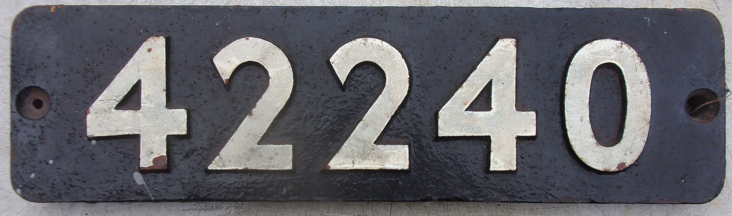 Locomotive Smokebox Numberplate “42240”, as carried by Fairburn 2-6-4 Tank Loco, built Derby works 1946. Allocations include Polmadie, Greenock, Corkerhill, Chester Mid, Bolton. Withdrawn in 1966. 2 x images to view.