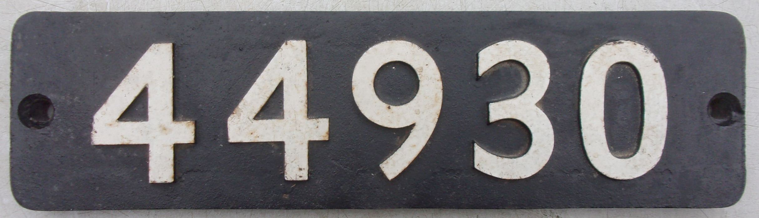 Locomotive Smokebox Numberplate “44930”, as carried by Stanier 5mt, built Crewe Works. Emerging to traffic March 1946. Allocations included Blackpool Central, Warrington Dallam, Springs Branch. Withdrawn from Dallam in May 1967, one of the last in service. Repainted face, clean ex loco back. 2 x pictures to view.