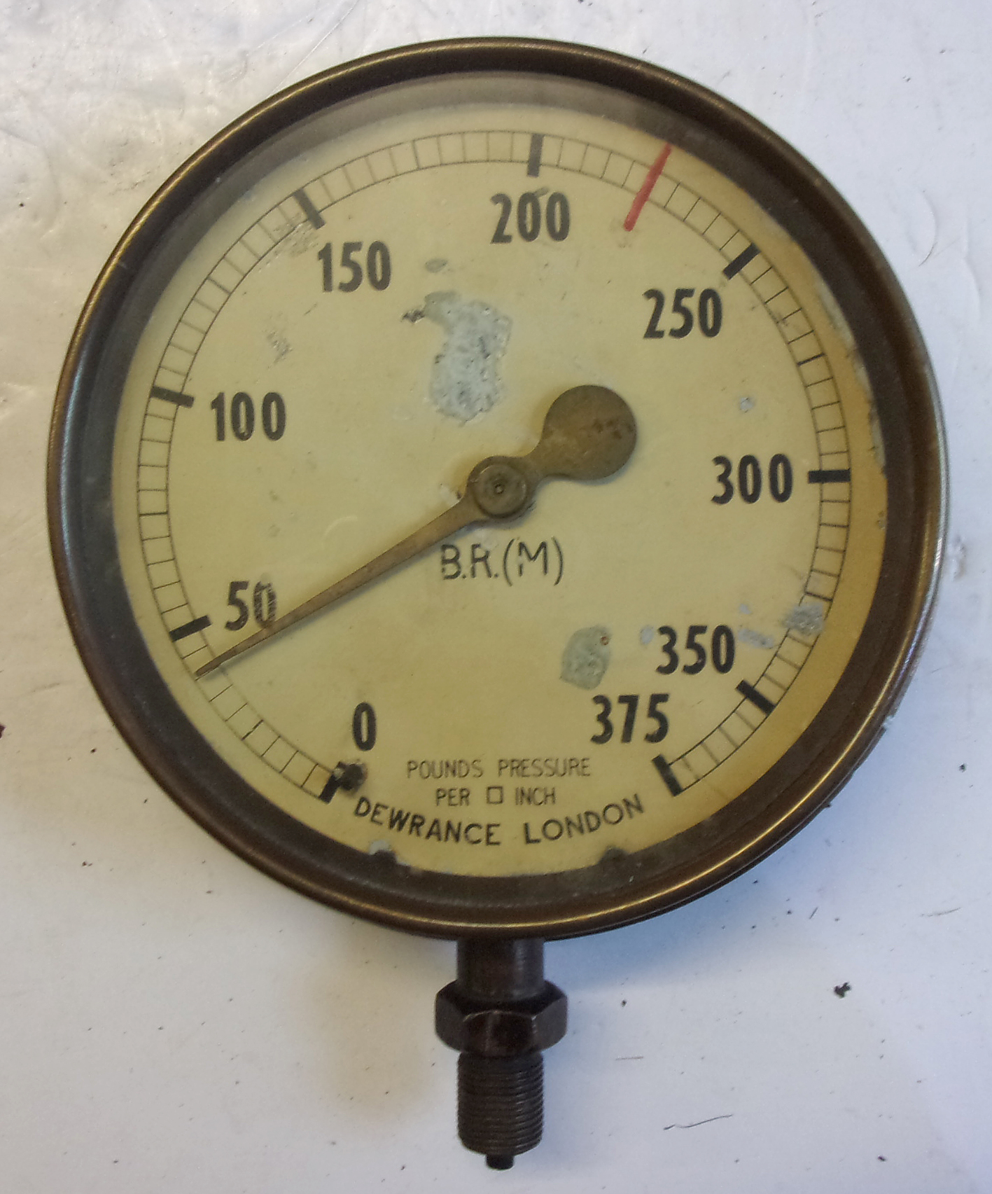 Locomotive Steam Pressure Gauge, face written “BR(M) Dewrance London 0-375″, brass case. 6” diameter. 2 x pictures to view.