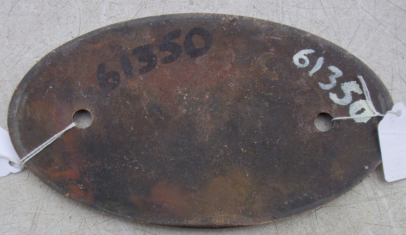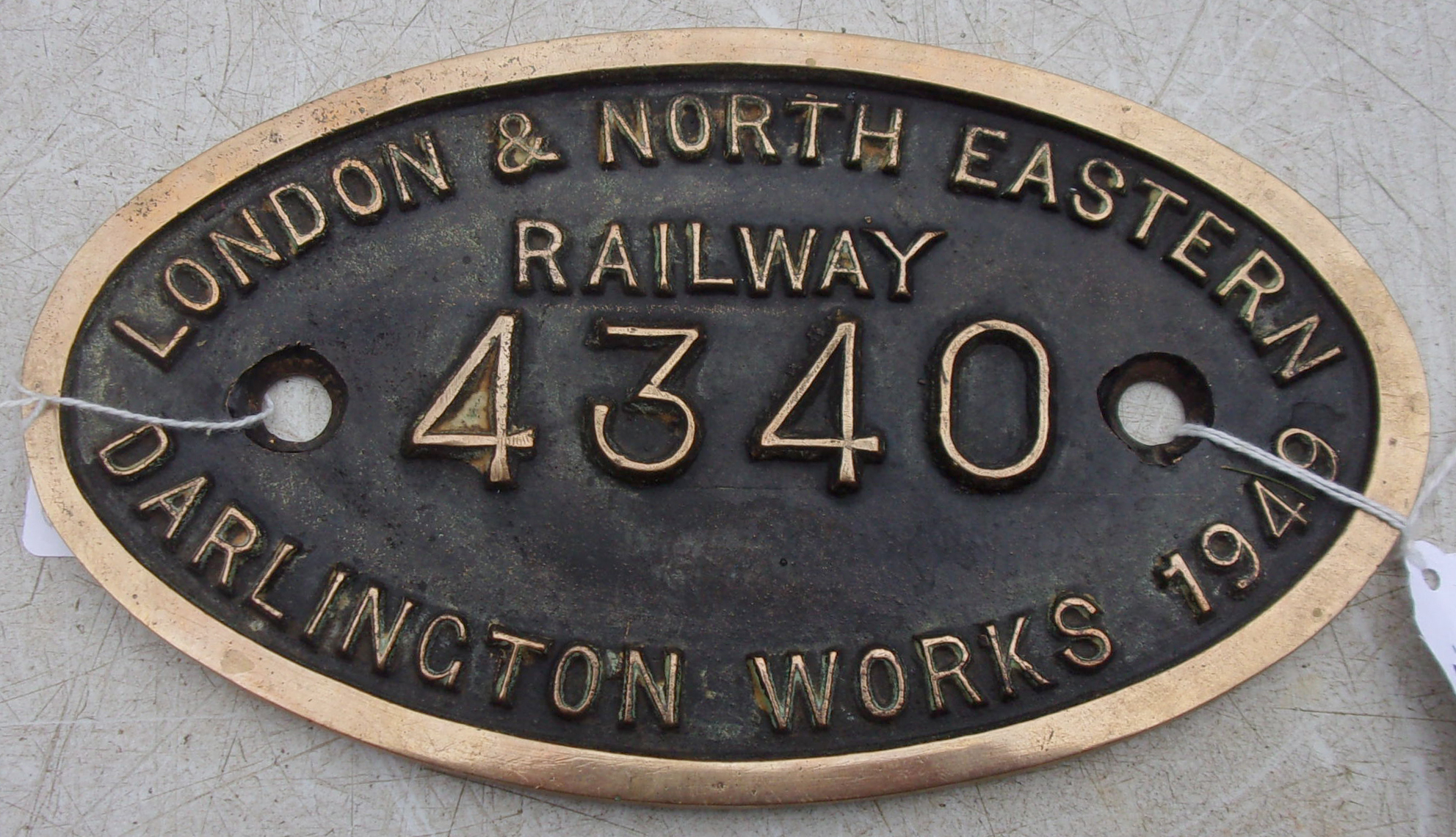 Locomotive Works Numberplate “London & North Eastern Railway Darlington Works 1949 4340”, as carried by Thompson B1 Class numbered 61350. Repainted face, ex loco back. 2 x pictures to view.