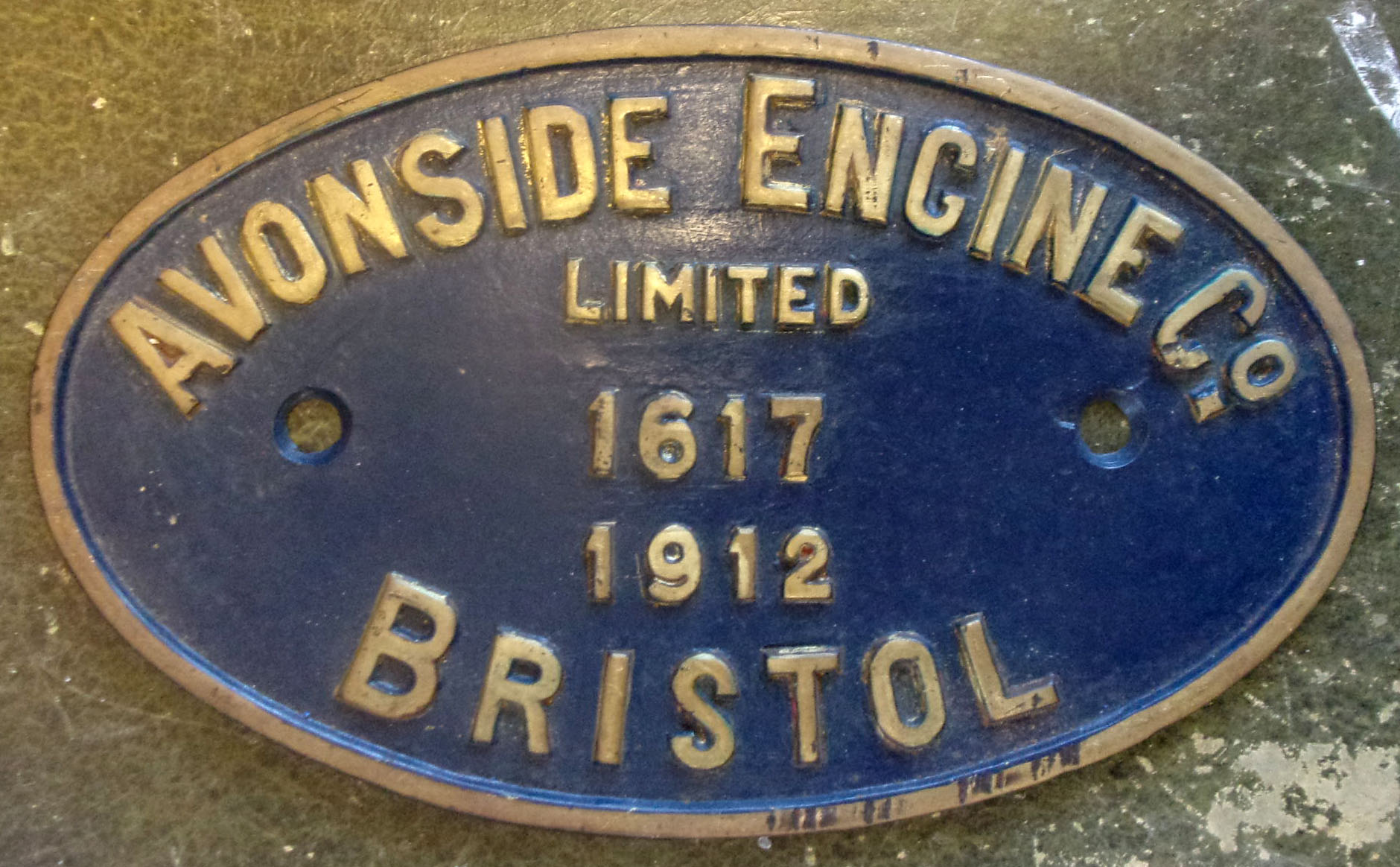 Locomotive Worksplate “Avonside Engine Co. Bristol Limited 1617 1912″, Cast embossed brass. 10 3/4″ x 6 1/2”.