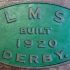 Locomotive Worksplate “LMS Built 1920 Derby”. Locos built this year are 30 x Fowler 4s, 0-6-0 Tender Engines. Embossed cast brass. Repainted face. Clean ex loco back.