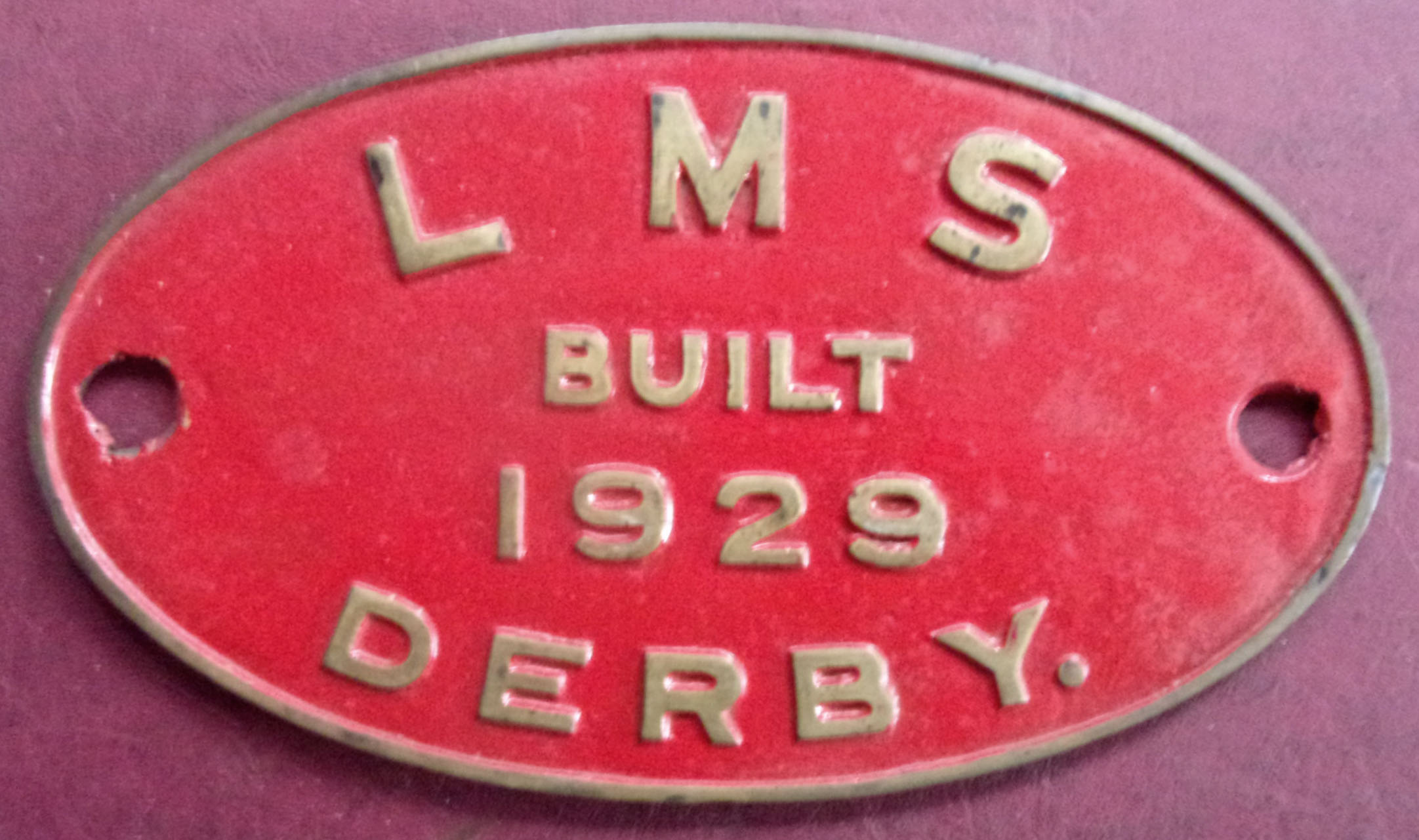 Locomotive Worksplate “LMS Built 1929 Derby”. Removed from Fowler 2-6-4 Tank Loco 42328. Allocations included Nottingham, St Albans, Plaistow, Neasden, Hitchin, Gorton, Walton on the Hill, Trafford Park. Withdrawn in 1961. Embossed cast brass.
