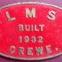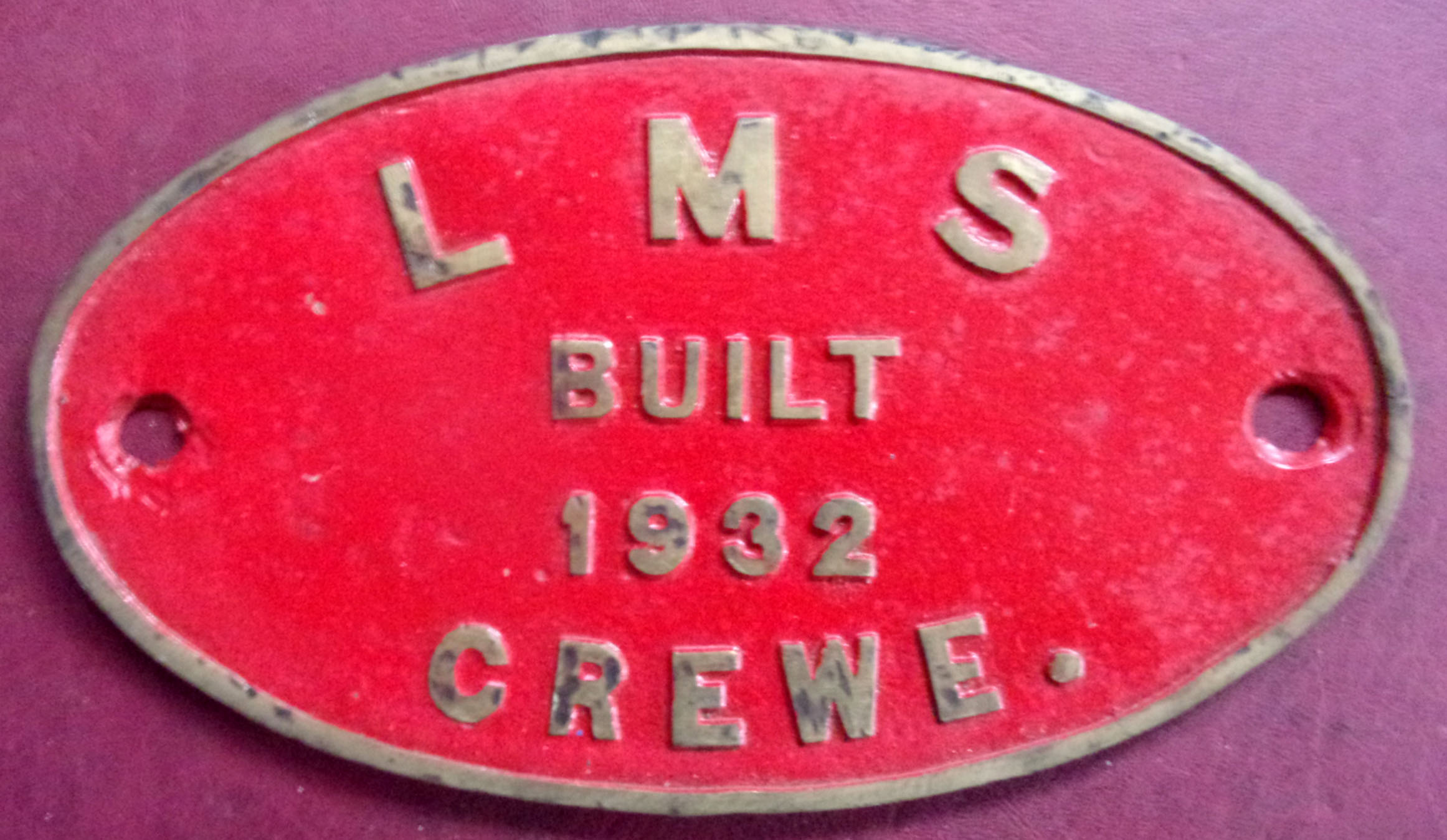 Locomotive Worksplate “LMS Built 1932 Crewe”. Removed from Hughes Crab 42937. Allocations included Longsight, Willesden, Crewe North & South, Edgeley, Stoke, Birkenhead. Withdrawn 1965. Embossed, cast brass.