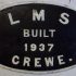 Locomotive Worksplate “LMS Built 1937 Crewe”, locomotives built this year were 5 x Coronation Pacifics, 7 x 8Fs, 15 x Derby 4s, 16 x Stanier 2-6-2 Tanks. Embossed cast brass. Repainted face, ex loco back.