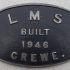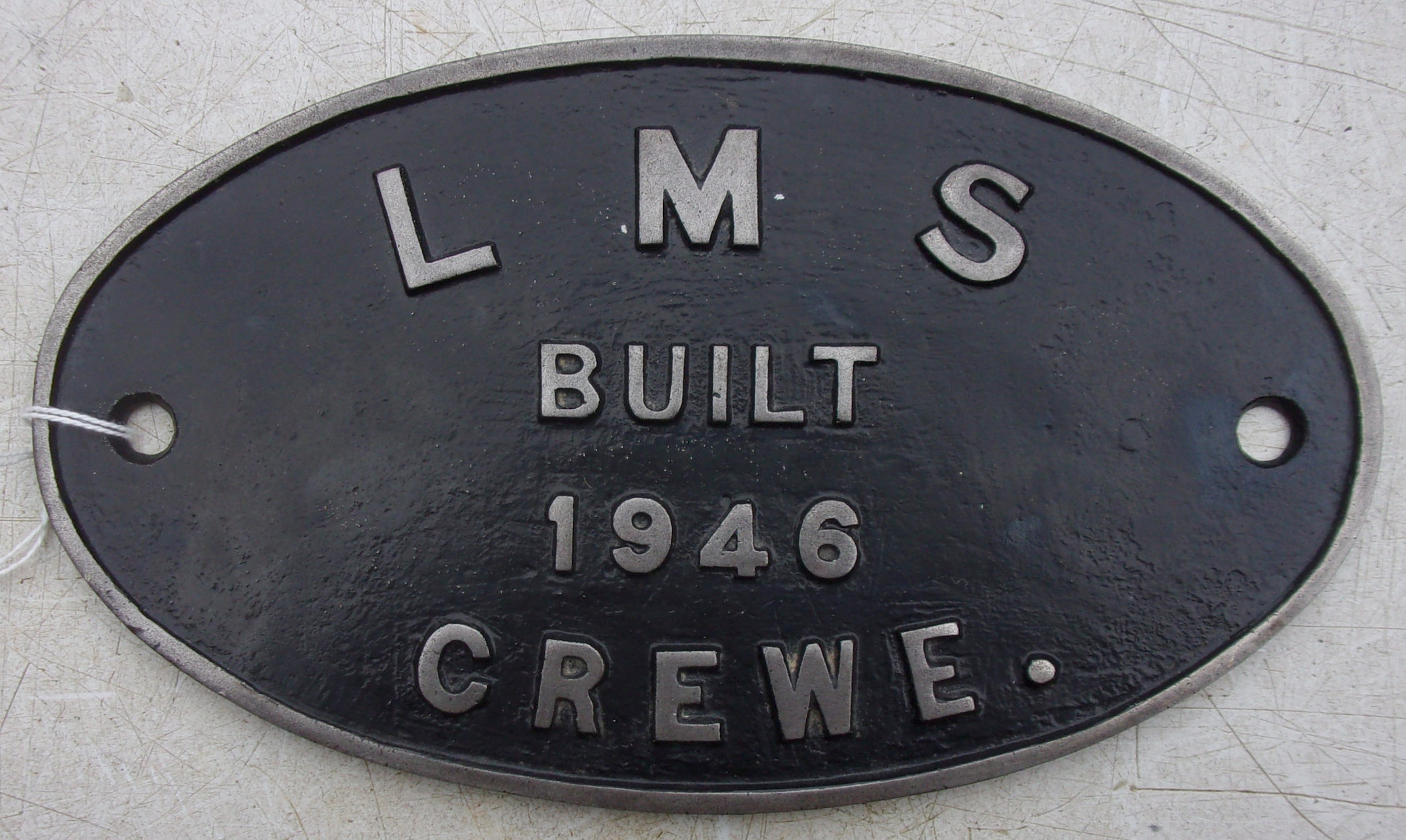 Locomotive Worksplate “LMS Built 1946 Crewe”. Locos built this year were 26 x Stanier Class 5s, 13 x Ivatt 2 MT, 10 x Ivatt 2MT Tanks, 3 x Stanier Coronations. Cast iron, repainted face. Clean ex loco back. 2 x pictures to view.